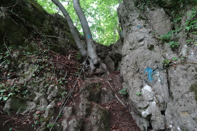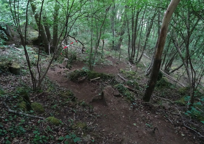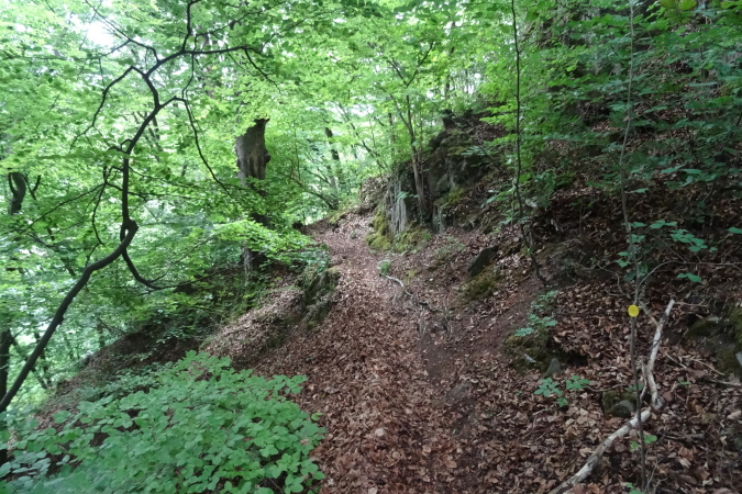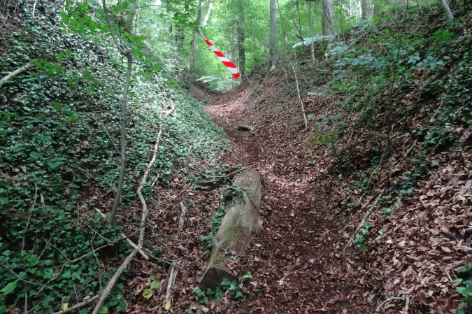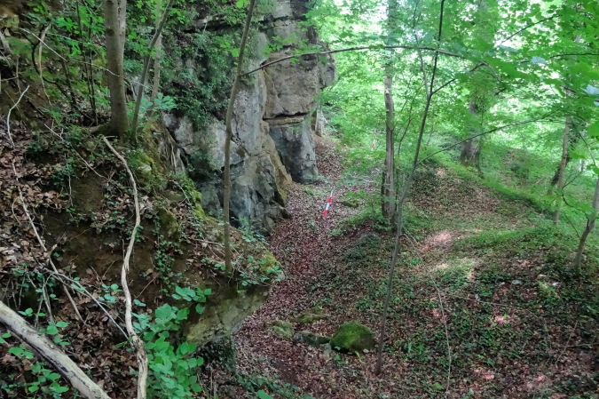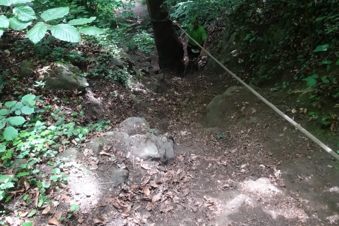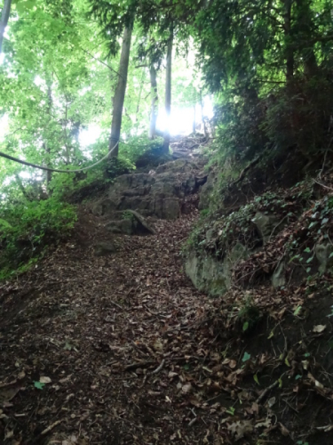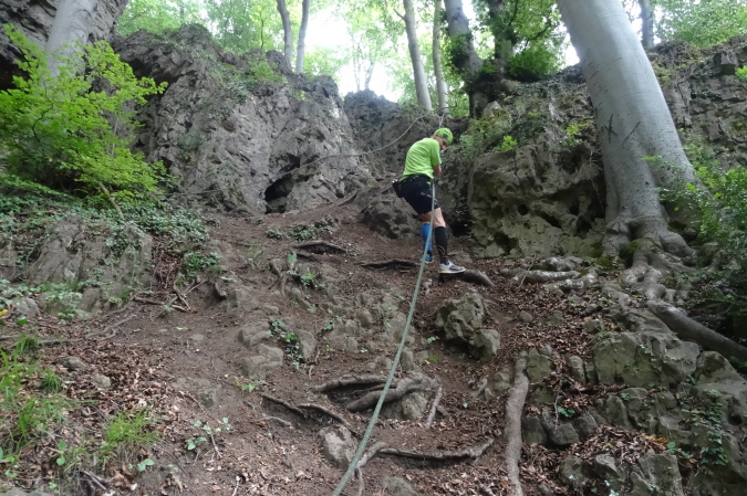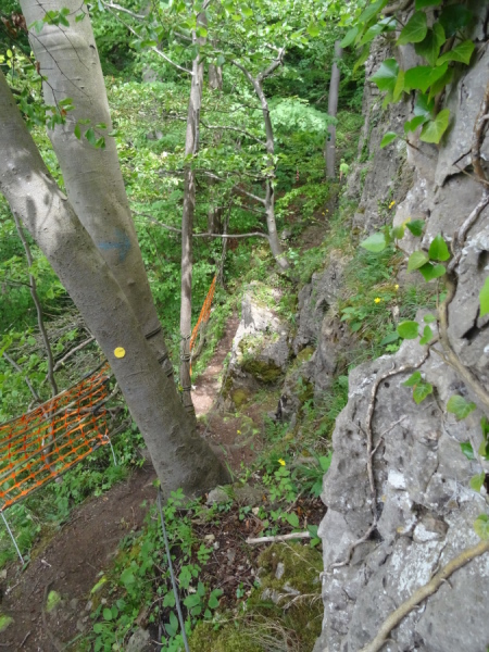 Die folgende Felspassage zeigt dann wieder steil nach unten. Langsam komme ich mir vor wie Luis Trenker. Abseilen ist angesagt. Unten erwarten uns herrliche Singletrails und der nächste Felsaufstieg. Eine kurze Passage am steilen Hang ist sogar mit Fangnetzen gesichert. Ein freundlicher Steckenposten hält das für mich auf einem Foto fest. Wieder geht es hinunter zur Maas. Endlich erreichen wir den letzten spektakulären Aufstieg im Fels. Fortan geht es am steilen Hang entlang. Yves ist mir mittlerweile etwas enteilt, da ich ab und zu mit Wadenkrämpfen zu kämpfen habe. Aber ich hole ihn wieder ein.