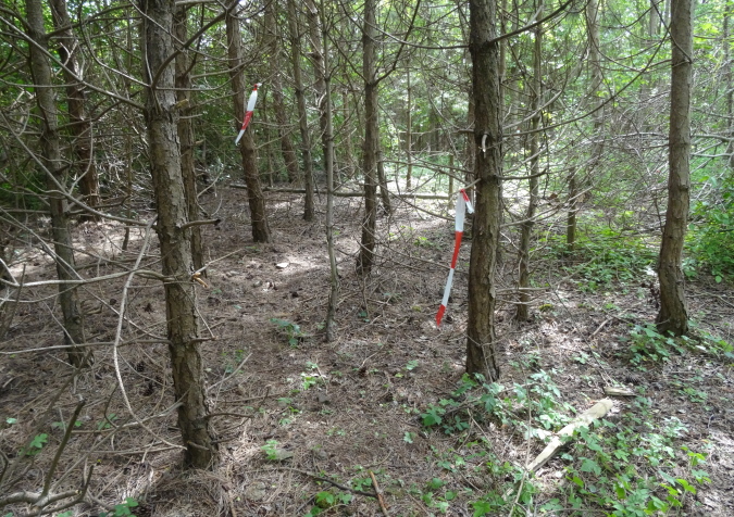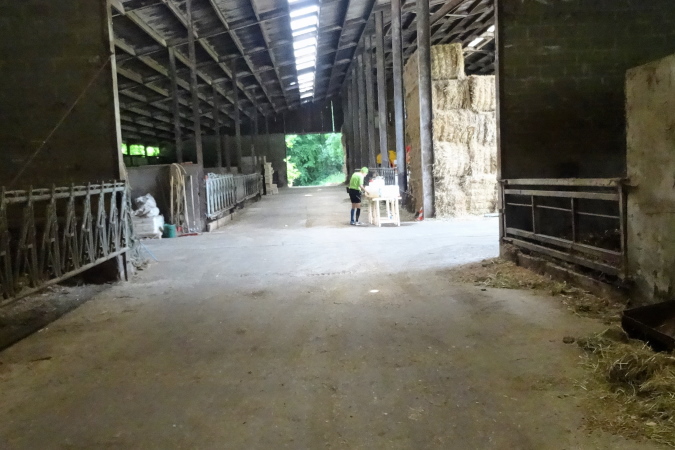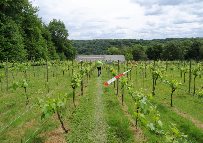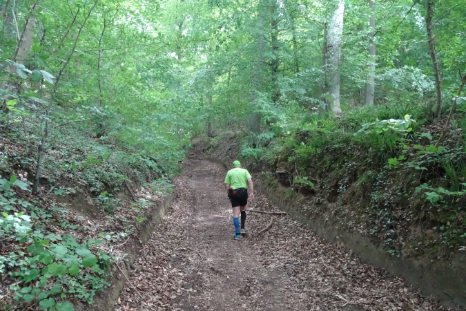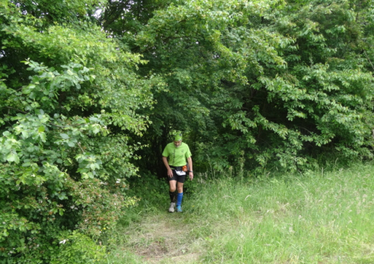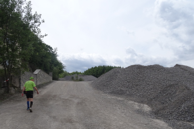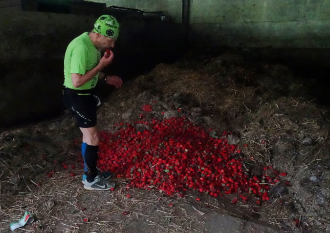 Kaum haben wir den Canyon verlassen, erreichen wir eine kleine Weinanbaupazelle, zu der auch ein Kuhstall gehört. Im Kuhstall ist eine unbemannte Wasserstelle eingerichtet. Auf einem Misthaufen hat man Erdbeeren entsorgt, deren besten Stücke Yves und ich genüsslich verzehren. Hinter dem Kuhstall erreichen wir eine Treppenpassage hinauf zu einem Steinbruch, dann sind wir wieder im Wald und es geht heftig bergan. Die Streckenmarkierung ist exzellent. Das muss auch sein, denn manchmal kann man den Verlauf des Trail kaum erkennen. Am äußeren Rand des Steinbruches müssen gilt es, einen Sandhügel zu erklimmen. Dann ist erst Mal Schluss mit Wald. Stattdessen führt uns die Strecke etliche Km entlang von Felder und Stacheldraht zur einzigen VS mit köstlichen Erdbeeren. Hier verliere ich Yves, der sich an den diesmal erntefrischen Erdbeeren wohl sattessen will.