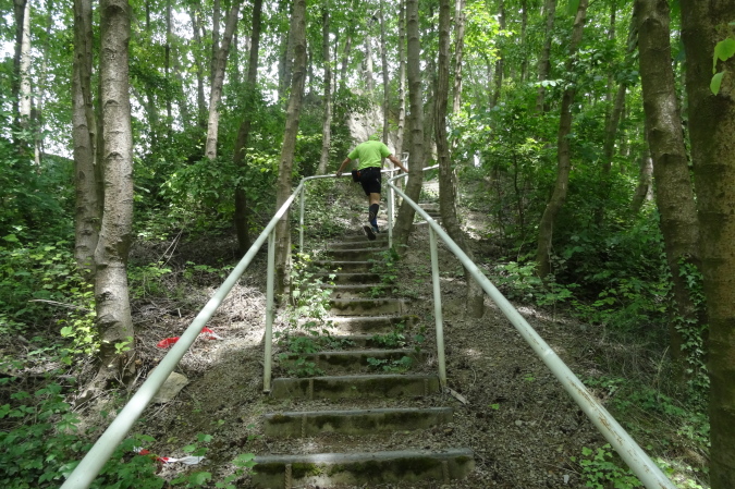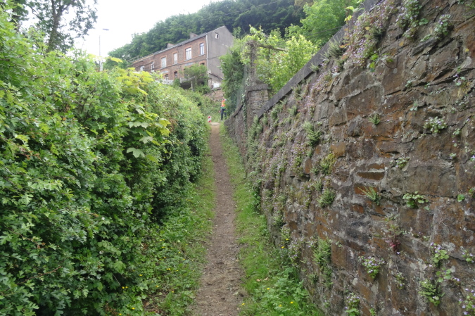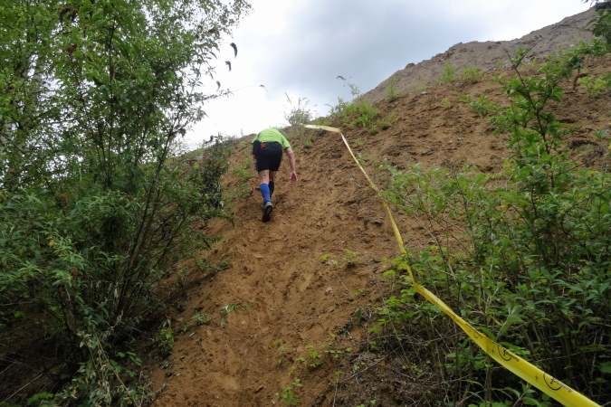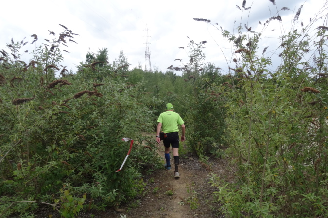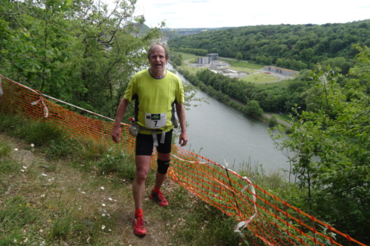 Oben am Scheitel ist dann die Streckenteilung. Hier sagt meine innere Stimme: Nimm den Rest der 17 Km Strecke und quäle dich nicht mehr. Der Streckenposten deutete mir aber an, dass auf dem 32 Km Trail gleich die Passage in den Steilklippen über der Maas, die ja in Belgien Meuse heißt, beginnen würde. Natürlich will ich das erleben und aufs Foto bannen, deswegen bin ich ja hier.