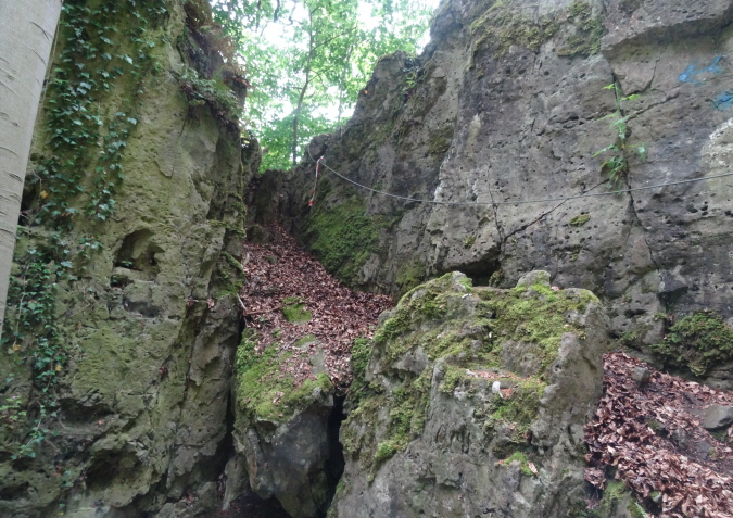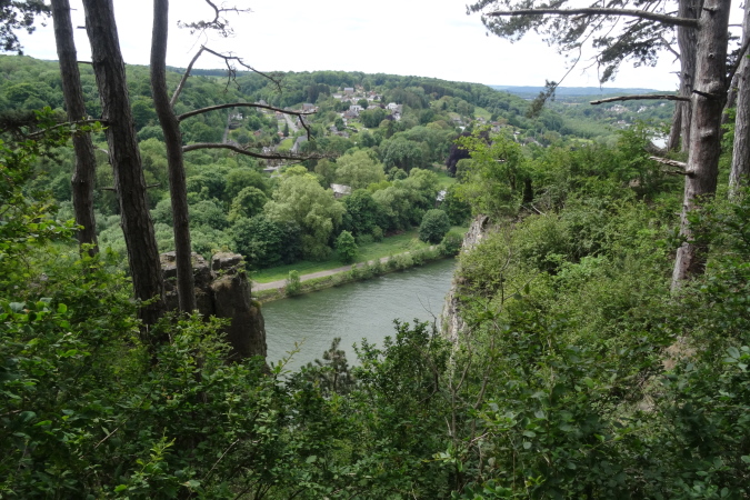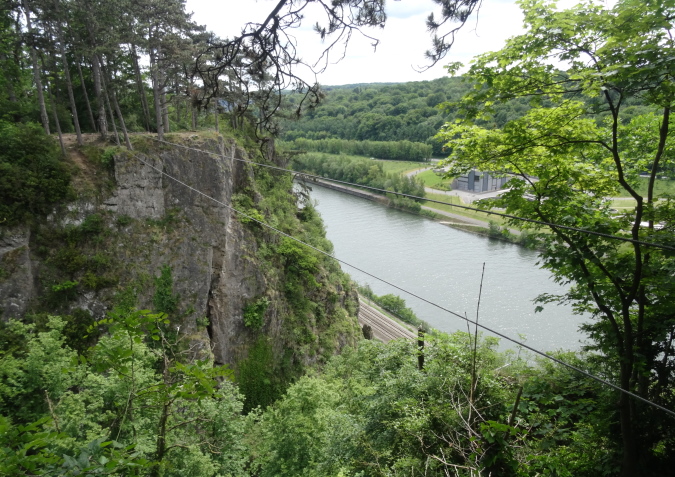 Zuerst geht es aber wieder bergab zu einem Chateau. Hinter dem Chateau beginnt dann mein Herz heftiger zu schlagen. Hier in den Felswänden kann man sich nur noch mit Hilfe von Seilen, die von Baum zu Baum gespannt sind, nach oben, bzw. wieder nach unten hangeln. Yves muss wieder als Fotomodell herhalten. Nach der ersten Kletterpartie hat man dann oben auf einem Plateau einen schönen Ausblick auf die Maas und dem Dorf am gegenüberliegenden Hang.