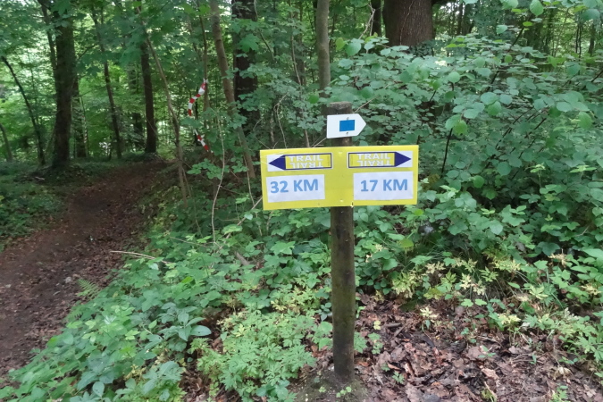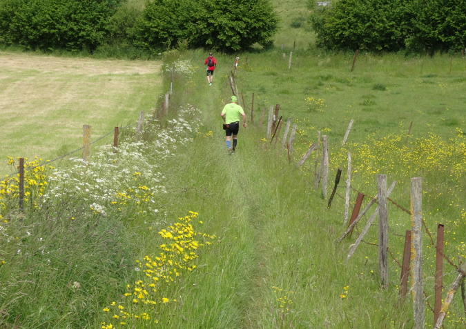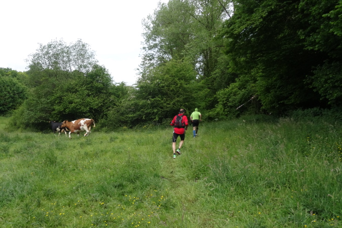 Um 11 Uhr gehen 146 Trailer auf die 32 Km Strecke. Die Läufer des 17 Km Laufes werden 15 Minuten später auf die Reise geschickt. Als erstes müssen wir eine kleine Dorfrunde laufen. Nach Verlassen des Ortes geht es entlang von Feldern bergab zu einem kleinen Bach im Wald. Auf einem Singletrail führt der Pfad durch einen sattgrünen Wald mit herrlichen Wildstauden zu einer Kuhweide mit wilden Kühen. Hier bin ich bereits wieder Letzter, aber immer auf Tuchfühlung zu zwei weiteren Läufern.