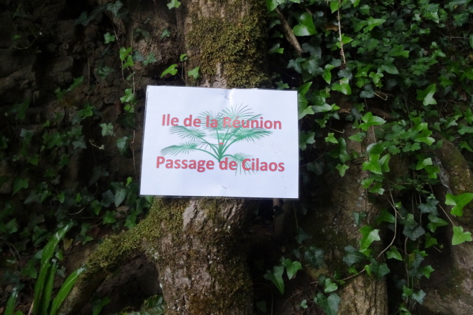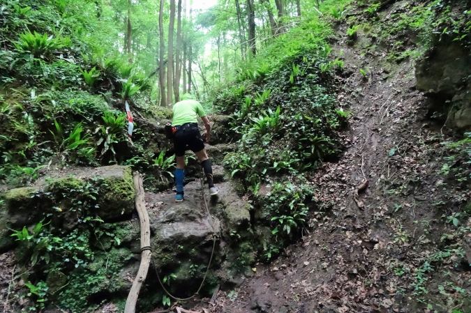 Kaum hat man sich auf den Höhen etwas regeneriert, ist sofort wieder höchste Konzentration erforderlich. Oft kommt man auf den steilen Abwärtspassagen nur mit Hilfe von Bäumen voran, an denen man sich festhalten kann. Dann weist uns ein Schild in einen Dschungel und Canyon. Sattgrüne Vegetation und ein Traum von Singletrail begeistern Yves und mich.