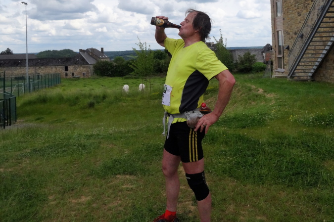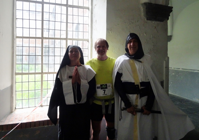 Wieder trockenen Boden unter den Füßen erreiche ich das verfallene Kloster „Notre-Dame du Vivier“. Im Kreuzganges werde ich von dem angeblich letzten Kreuzritter, einer Nonne und einem Mönch empfangen. Ich probiere etliche Klosterliköre und mache mich auf die letzten 2 Km. Es geht durch den schönen Klostergarten und einem kleinen Friedhof. Ich kann nur noch stramm marschieren, da es ständig bergan geht. Am Sportplatz empfängt mich Marita mit einem köstlichen belgischen Bier (Leffes), dass noch heute nach alten Klosterrezepten gebraut wird. Nach einer ebenso köstlichen Pasta hole ich mir mein Finishershirt und wir machen uns auf den Heimweg. Übrigens, Yves kam 12 Minuten nach mir ins Ziel und wurde damit Letzter.