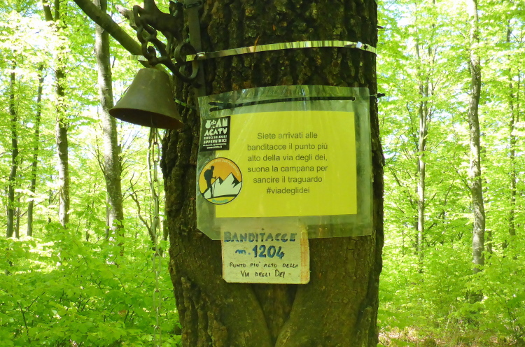 Das Angebot ist sehr üppig und obwohl ich in der Nacht eigentlich nichts essen wollte, um Magenproblemen vorzubeugen, kann ich bei der Mortadella und dem Parmesankäse nicht widerstehen. Eine Flasche wird mit Wasser aufgefüllt, in die andere kommt Tee und schon geht es weiter. Schnell erreichen wir den ersten namensgebenden Gipfel, den Monte Adone. Astrid ist schon ein Stück vor uns und wir werden sie erst in Fiesole wiedersehen. Wir beiden alten Männer lassen es gemütlich angehen.