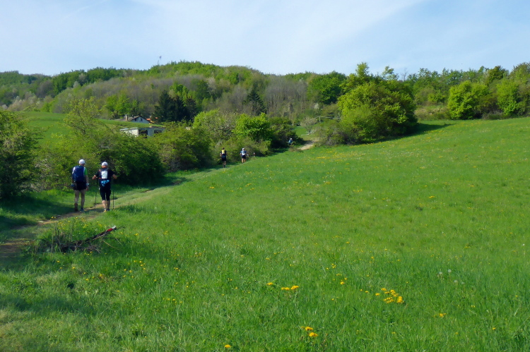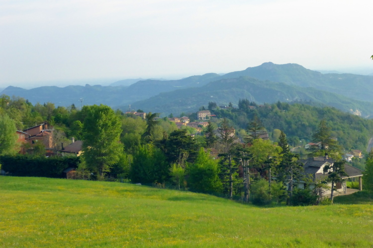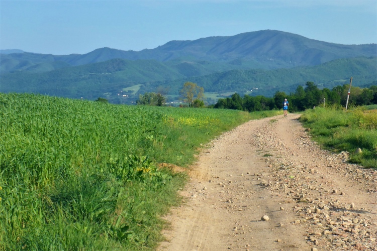 Auf guten Pfaden geht es jetzt hoch hinaus. Unter uns die typischen schönen Landschaften der Emilia Romagna. Schleierwolken schützen uns vor allzu großer Hitze und in der Höhe weht immer ein laues erfrischendes Lüftchen. Wir genießen die Strecke sehr. Wir sind weit vor dem Cutoff und müssen uns keine Sorgen machen. Mal sind wir im frischen Grün des Waldes, dann wieder freie Sicht über blühende Felder. Wir passieren Monte Venere und den Monte del Galetto. An der nächsten Verpflegung gibt es gekochte Kartoffeln. Ich tunke sie in Salz und spüle einige davon mit einer Dose Bier herunter. Sehr lecker. In die Flasche kommt nun Wasser mit einem Schuss Cola. Dazu drücke ich den Saft von ein paar Zitronenschnitten, damit auch der letzte Chlorgeschmack verschwindet.