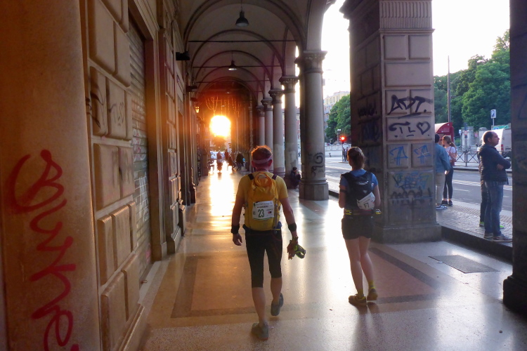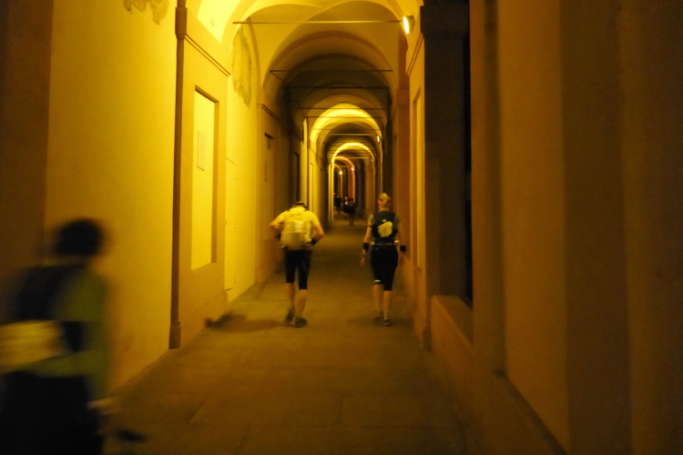 Wir starten mitten in der Stadt. Recht unspektakulär wird heruntergezählt und Punkt elf Uhr geht es los. Ein Motorradcorso der Polizei begleitet uns mit Blaulicht bis zur ersten Fußgängerzone. Die Nachtschwärmer geizen nicht mit Beifall und Anfeuerungsrufen. Die Läuferinnen und Läufer bedanken sich dafür ebenfalls mit Applaus und Zurufen. Eine herzliche Stimmung, die bei Veranstaltungen in Deutschland leider nur rudimentär vorkommt. Wir machen eine Sightseeing Tour durch die Stadt und laufen dabbei immer auf der Straße, die für uns von zahlreichen Helferinnen und Helfern gesperrt ist. An den Ampeln überall Polizei. Kein Gemotze, sondern Anfeuerungsrufe aus den wartenden Autos und Applaus. So kann das also auch gehen. Nach ein paar innerstädtischen Highlights kommen wir zu den Arkaden, die uns bis zum Kloster von San Luca, unserem ersten Gipfel, führen. Noch ein letzter Blick auf die Lichter der Großstadt unter uns, dann wechseln wir auf die andere Bergseite.