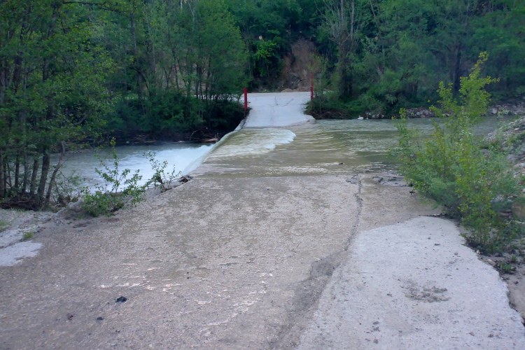 Ein gut laufbarer Downhill bringt uns wieder ins Tal. An der Wasserstation fülle ich nach, merke aber schon beim Eingießen, dass es Leitungswasser ist. Damit ist die Flasche verseucht. Der Chlorgeschmack erzeugt bei mir heftiges Würgen. Naja, ein halber Liter wird bis zur nächsten Verpflegung reichen. Es ist recht frisch im Tal. Ich ziehe die Ärmlinge hoch und einen Schal über. Das muss reichen. Die Wege werden jetzt ausgespült. Unschwer erkennt man noch die Folgen des Unwetters, das hier getobt hat. Als wir zu einem Fluss kommen, laufen wir über große Flächen von Sand, der aus dem Berg gespült wurde. In vielen Rinnsalen läuft das restliche Wasser zum Fluss, der uns eine Zeitlang mit seinem Rauschen begleitet.