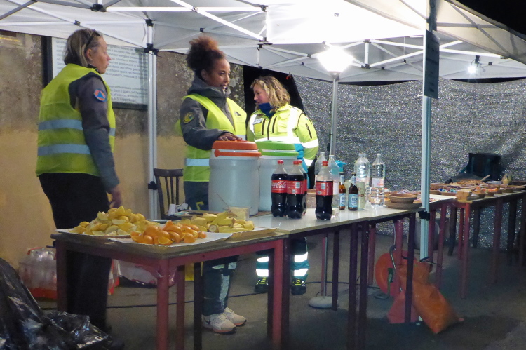Bei km 75 erreichen wir unsere Dropbags. An der Verpflegungsstelle ist ein großes Zelt aufgebaut. Hier sind heute Morgen Mike und Marc auf die 55 km Strecke gestartet. Zuerst nehme ich eine Portion Pasta. Bier gibt es leider nicht. Dann wasche ich mich und ziehe mir frische Kleidung an. Die neuen Schuhe sind eine Wohltat. Wir lassen uns Zeit. Wir sind dreieinhalb Stunden vor dem Cutoff und außer meiner Müdigkeit, die irgendwie nicht verschwinden will, ist alles noch sehr frisch. Bukis Füße haben ziemlich gelitten. Aber dass es kein Spaziergang wird, war uns ja klar. Meine Nadel zum Aufstechen der vermuteten Blase braucht er jedenfalls nicht. Alles schon offen. Also schnell neue Socken und Schuhe und weiter geht es in den Anstieg zum Monte Gazzarro.