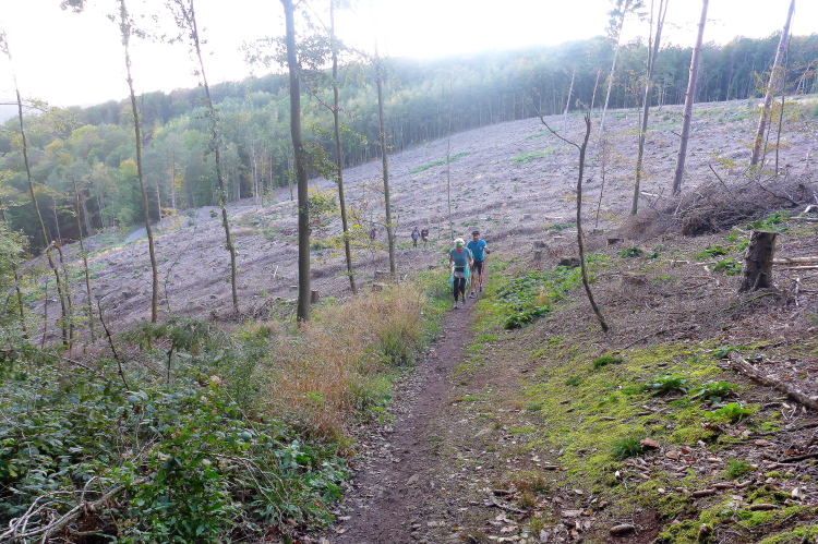 Wir müssen über einen ungefallenen Baum, sieht so aus, als ob dieser den Weg schon länger versperrt. Dann kommt schon einer der markanten Streckenabschnitte: Der Weg geht senkrecht hoch in den Wald! Wer möchte, kann am Fuß der Steigung ganz offiziell nach links abbiegen und der „Pussy-Lane“ folgen. Dort steigt die Strecke etwas sanfter an, ist dafür aber rund 100 m länger. Fast alle vor mir nehmen die steile Variante, also hinterher.