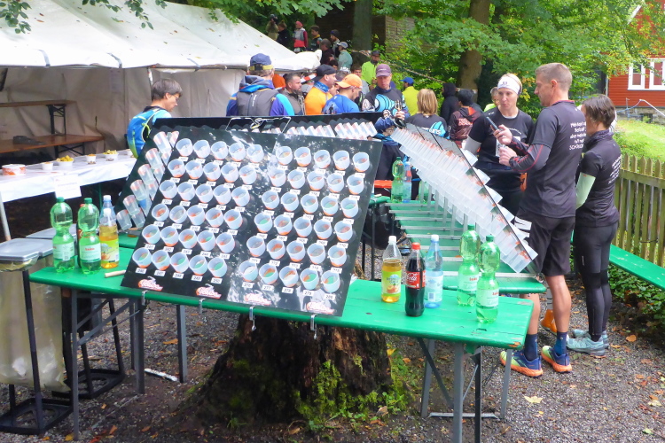 Der Raceday beginnt mit einem ausgiebigen Frühstück und der Abholung der Startnummer. Für einen Chip am Armband zur Zeitnahme sind 10 € Pfand zu entrichten. Mit diesem scannen wir im Ziel jede unserer Runden selbstständig ein. Gelaufen wird auf eine 4,11 km Runde mit 130 Höhenmetern, welche direkt hinter dem Jugendhof beginnt. Wir erkunden das Gelände zur besseren Orientierung. Es stehen zwei Zelte direkt an der Strecke zur Verfügung, hier werden auch schon Tische für Eigenverpflegung aufgebaut. Daneben hat sich das Team vom DRK eingerichtet. Oberhalb vom Waldschlösschen ist die zweite Area aufgebaut. Neben einem Unterstand mit Feuerstelle wird das Athleten-Buffet vorbereitet, davor hat jeder seinen persönlichen Becher mit der Startnummer zum selber füllen. Die Zeitnahme ist direkt daneben, auf einem Monitor kann man die Führenden und seine eigenen Zeiten während dem Rennen in jeder Runde sehen.