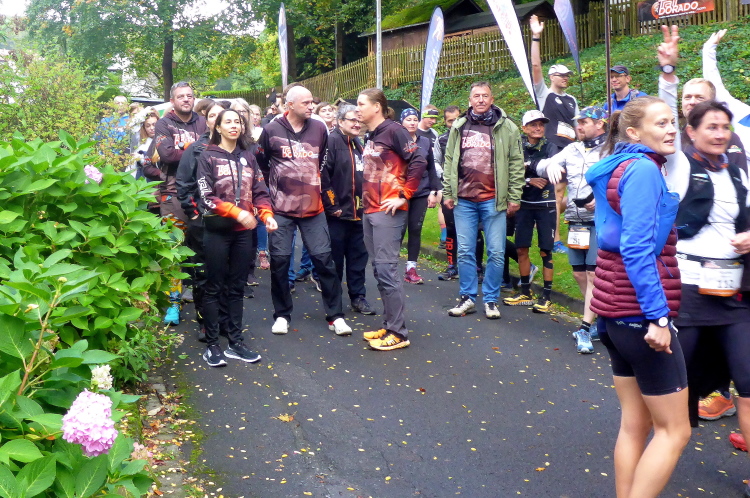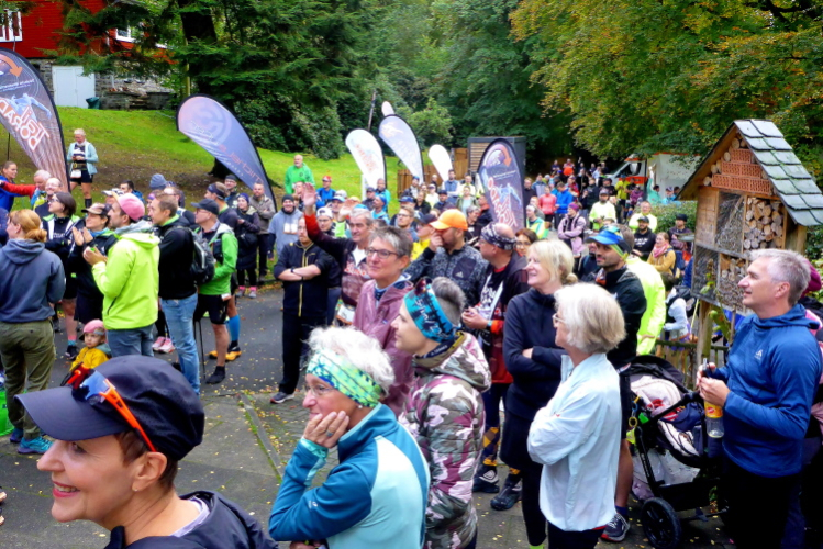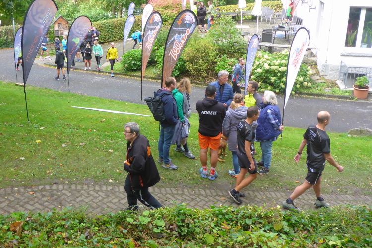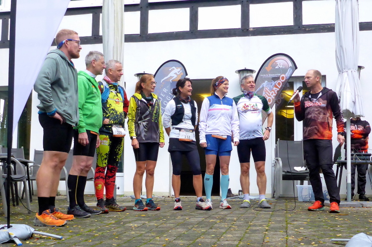 Alle wichtigen Informationen wurden vorab per Email versendet, und ein Online Briefing von 2021 wurde auch noch mal reaktiviert. Wer sich hierfür etwas Zeit nahm, findet sich vor Ort gut zurecht. Um 11 Uhr gibt es unser Briefing auf der Terrasse vor dem Schlösschen. Die Musik wird hochgefahren und es läuft der Event-eigene-Song: We´re Traildorado! Heiko moderiert und bittet die Teilnehmer, die zum 5. Mal dabei sind, zu sich. Jörg ist zum 11. Mal dabei und steht 16 km vor dem 1000. Traildorado Kilometer! Der Applaus von uns allem ist ihm gewiss. Dann ruft Heiko das Helferteam auf die Terrasse und wir können uns schon mal bei den vielen helfenden Händen bedanken die uns die kommenden 24h so angenehm wie möglich gestalten möchten. Dann kommt noch eine Nachricht rein die etwas auf die Zeit drückt: Den ausgewiesenen Parkplatz beim 650m entfernten EDEKA haben heute viele gewählt. Man hat keinen Platz mehr für die Kunden und bittet, dass umgeparkt wird. Das Briefing ist damit schnell beendet, man erwartet uns um 11:50 am Start.
