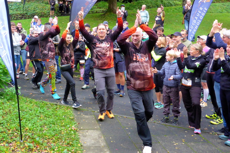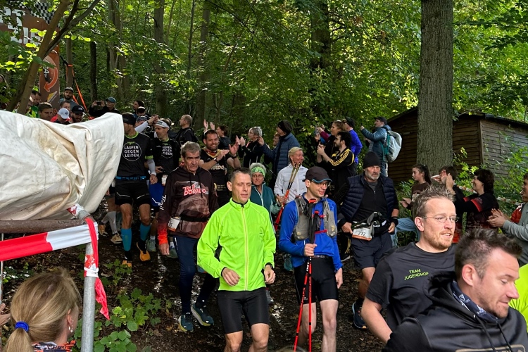 Wir springen durch einen alten Garten und laufen die letzten Meter im Zick-Zack auf das Ende der ersten Runde zu. Oben auf einer kleinen Anhöhe steht eine schwarze Kiste, an der wir ab der 2. Runde dann unsere Zeiten scannen können. Jetzt geht’s vorbei, die Anhöhe wieder runter und am Zielbogen klatscht Michele jeden persönlich ab. Wir sind im Versorgungsbereich, ein Schluck Wasser reicht nach 4,11 km. Tanja erwartet mich und fragt, wie es ist. Ich fluche über Wurzeln und Steine und betone, dass ich die Strecke nicht mag. Jammer über stolpern und umknicken, aber ich will ja Trail trainieren. So geht’s mit einem Motivations-Knutsch in die Runde 2.