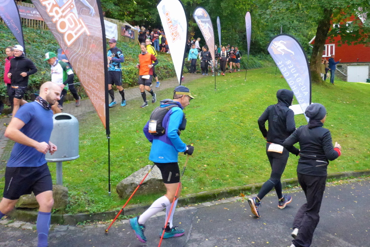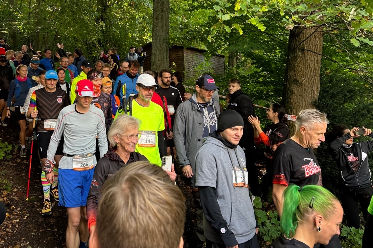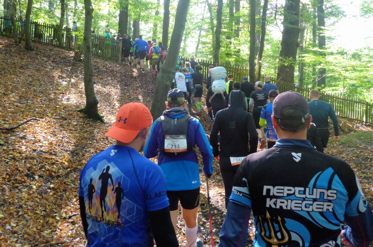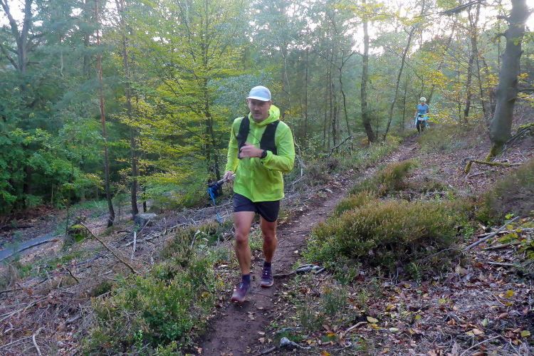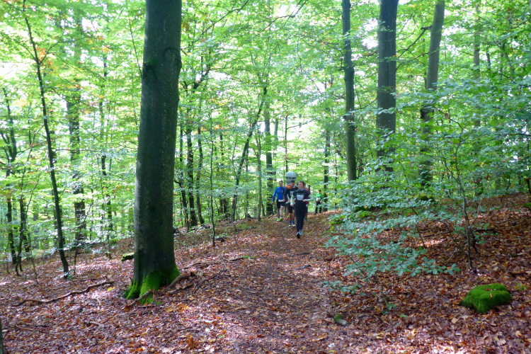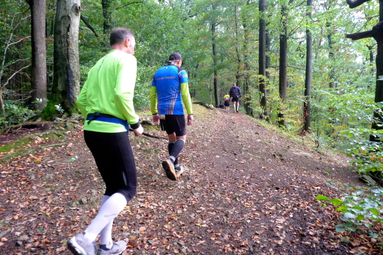 Die beiden laufen eine Einführungsrunde voraus, es herrscht Überholverbot. Wir starten bergab und laufen einen sanft abfallenden breiten Waldweg entlang. Das wird wohl nicht so bleiben! Nach rund 300 m endet dieser schöne Weg und es geht einfach gesagt eine Böschung hoch. Schon an dieser Stelle weiß ich, dass ich später Stöcke mitnehmen werde. Es steigt an, der Weg ist breit genug zum Überholen. Aus dem Höhenprofil habe ich im Hinterkopf das ungefähr in der Mitte nach 2 km der höchste Punkt liegt. Also auf Kräfte sparen, in der zweiten Hälfte rollen lassen.