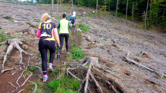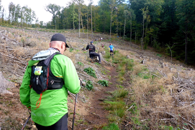 Michael bietet ein Workshop im Stickrunning an. Dieser wird einfach in sein Rennen integriert und ich passiere seine Gruppe, als er erste Instruktionen gibt. Unten angekommen wird es wieder ansteigend richtig trailig. Schmaler Single-Trail, jede Menge Wurzeln und jeder Schritt muss sitzen. Das Feld zieht zügig hier durch, ich nehme etwas raus und knicke trotzdem schon mal um. Wir kommen aus dem Wald und sehen, wie sich die bunte Schlange der Trikots über eine abgeholzte Freifläche nach oben arbeitet. Der Weg ist gut begehbar, viele Wurzeln und Steine sorgen dafür, dass dieser recht lange Anstieg Konzentration erfordert. Oben angekommen ist ein Blick zurück obligatorisch, die noch folgenden bunten Trikots ein schöner Anblick. Und wir haben auf dem Gipfel den 2. Kilometer erreicht.