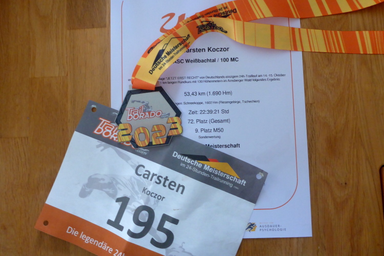 Mein Plan, 100 km zu laufen, ist krachend gescheitert. Die Hälfte hat immerhin gereicht, um in der deutschen Meisterschaft den 7. Platz in der AK zu bekommen. Und jetzt, wo ich die Strecke bei Regen kenne, wünsche ich mir, diese mal 24 Stunden ohne Regen zu erleben. Vielleicht nächstes Jahr? Ich sicher mir schon mal einen der limitierten Startplätze bei Michele. Es könnte ja trocken sein!