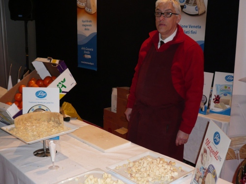 Die Marathonmesse ist klein, aber vom Feinsten. Obwohl ich die Anmeldefrist versäumt hatte, werde ich mit offenen Armen aufgenommen. Alles läuft reibungslos. Für Sabine bekomme ich sogar 2 Finishershirts, da ich ihre Größe nicht wusste. Mit den vollgepackten Startertüten schlendere ich über die Messe. Es gibt Kaffee, lecker Käse aller Art, Kuchen aus Radiccio, und die Universitätsklinik bietet kostenloses Hautscreening an. Mit der Gewissheit, in naher Zukunft nicht an Hautkrebs zu sterben, bemühe ich mich um Information bezüglich eines Shuttlebusses (Bus Navetta) am nächsten Morgen. Die gesamte Stadt sei gesperrt, Taxis fahren nicht, für mich ist keine Chance zum HBF (stazione FS) zu kommen, von wo die Busse zum Start (Partenza) nach Vittorio Veneto fahren.