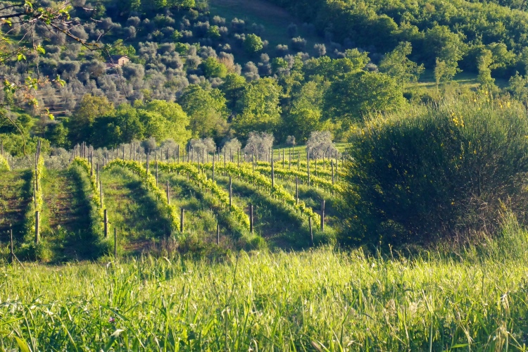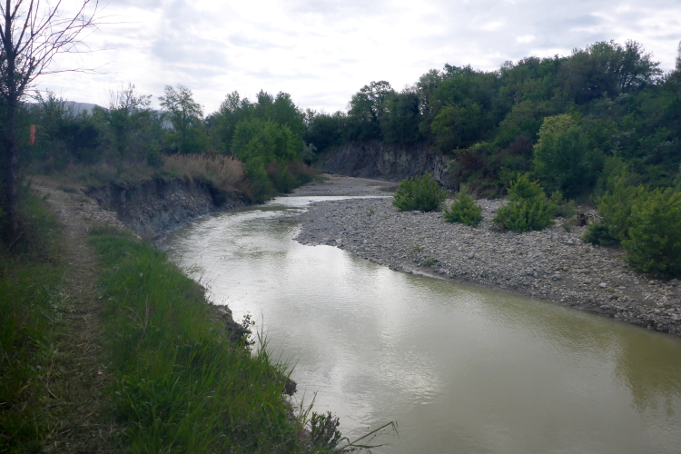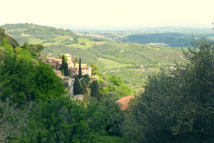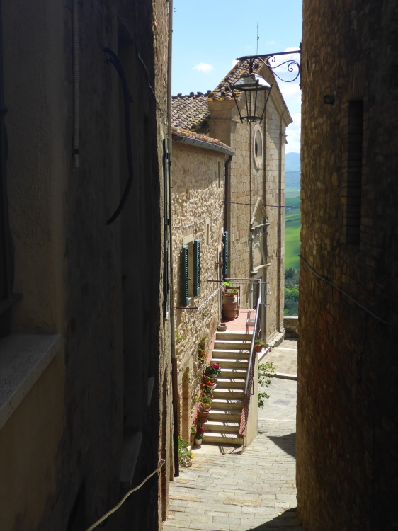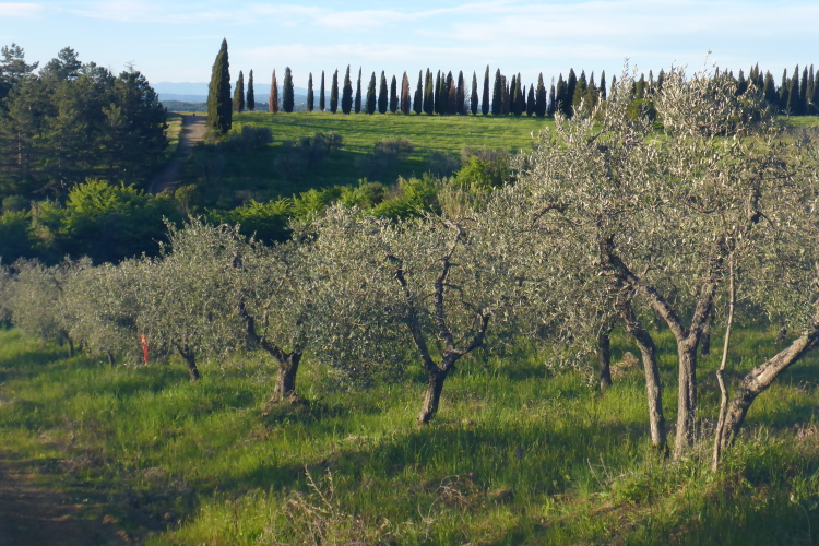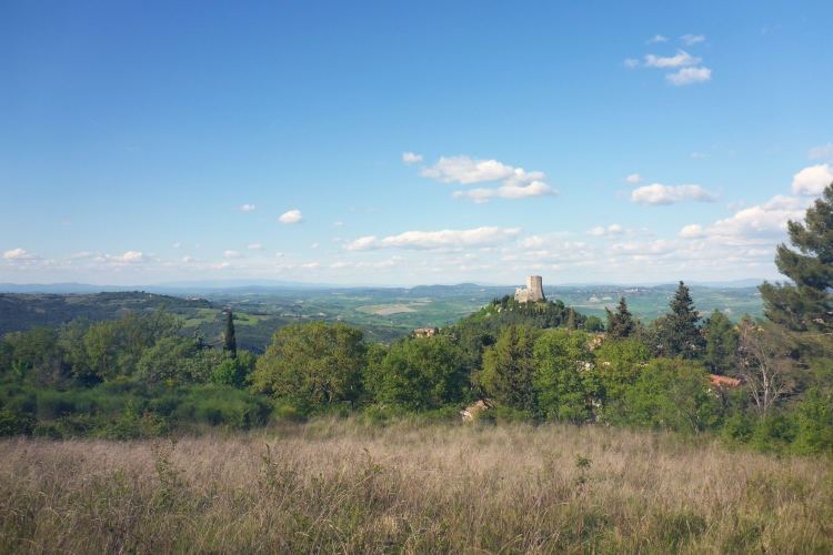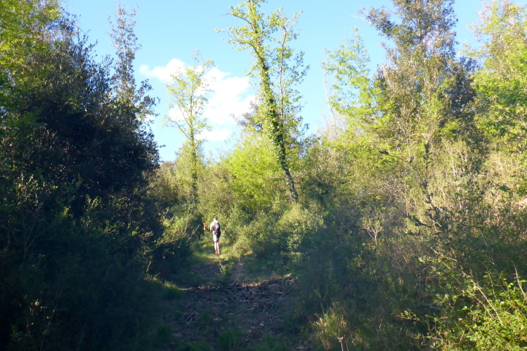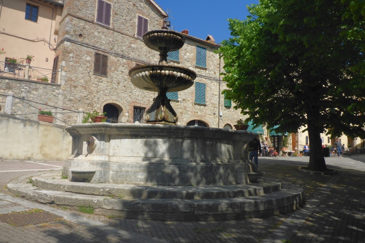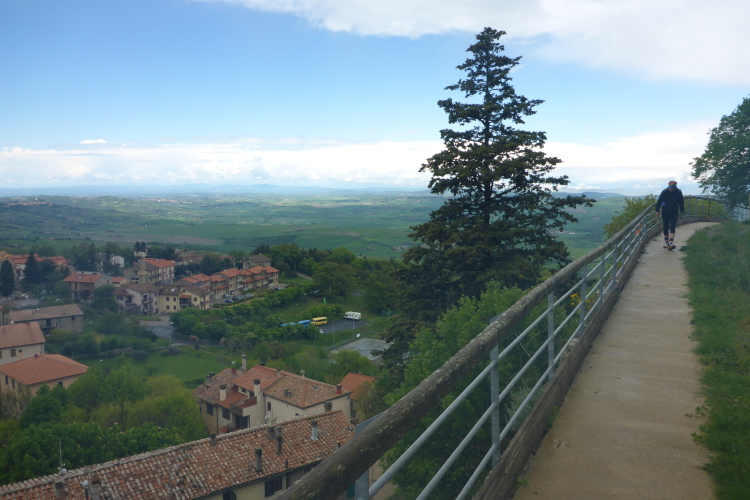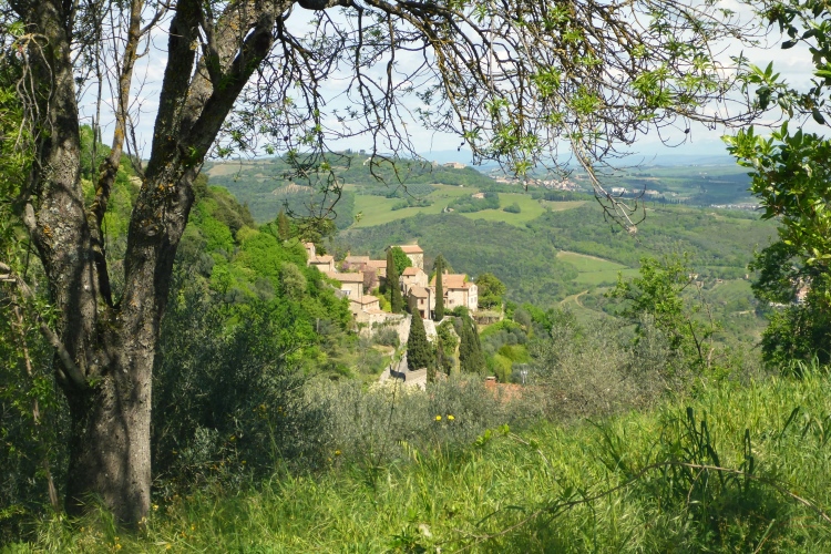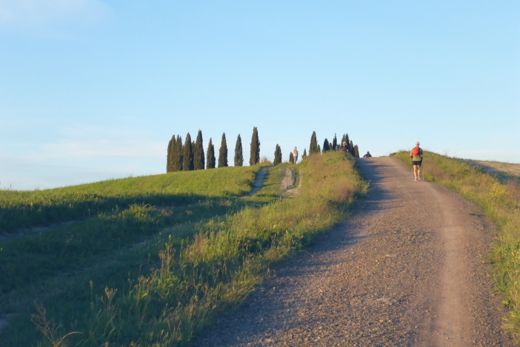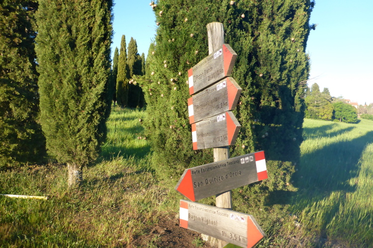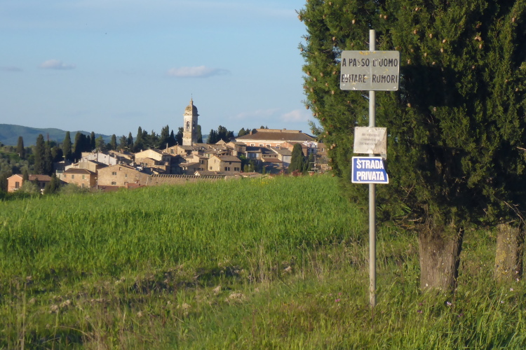 Zuerst durchlaufen wir Torreniere, eine Station auf der Via Francigena, dem bedeutenden Pilgerweg vom Frankenland nach Rom, der in den letzten Jahren zum Weitwanderweg ausgebaut wurde. Die Beschilderung von Canterbury nach Rom wird uns noch des Öfteren begegnen.