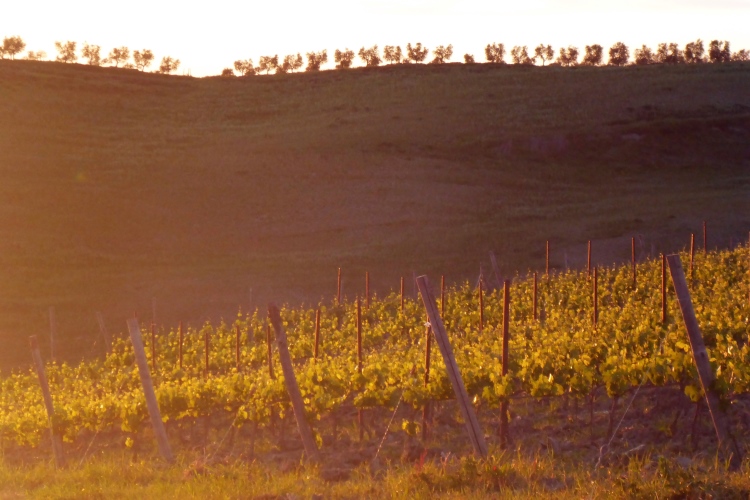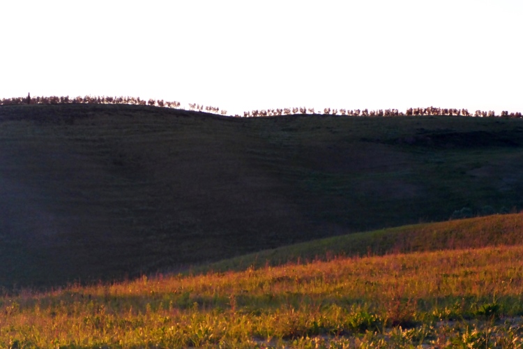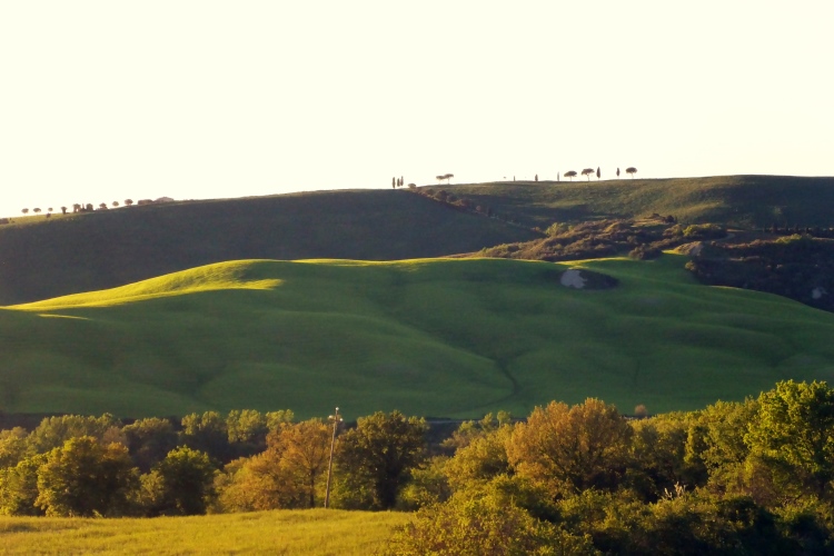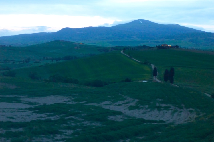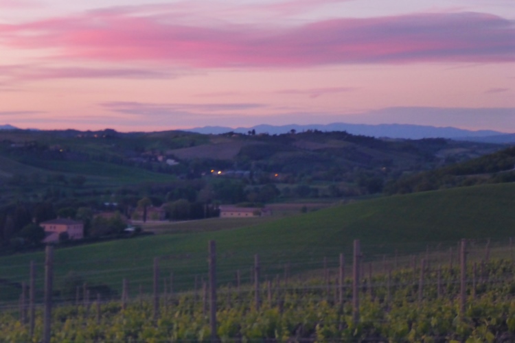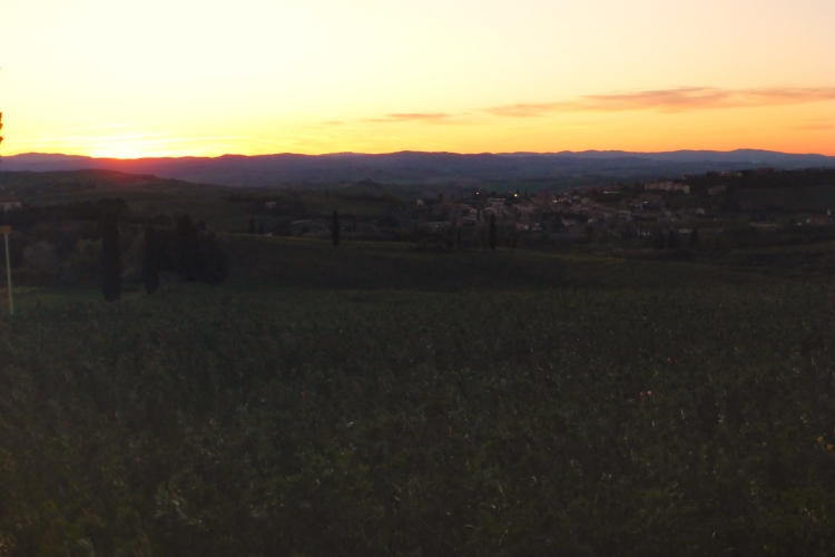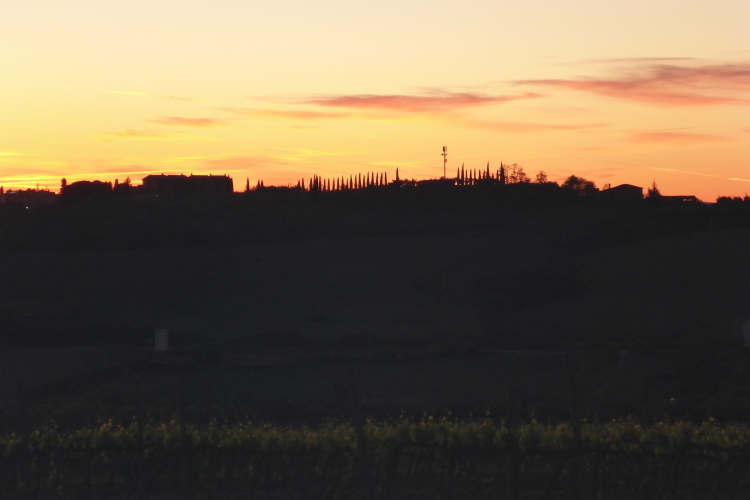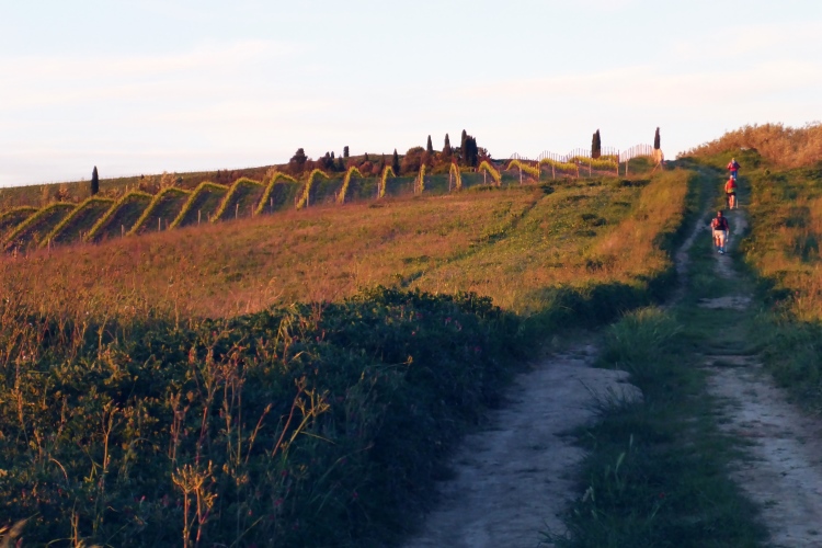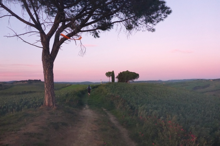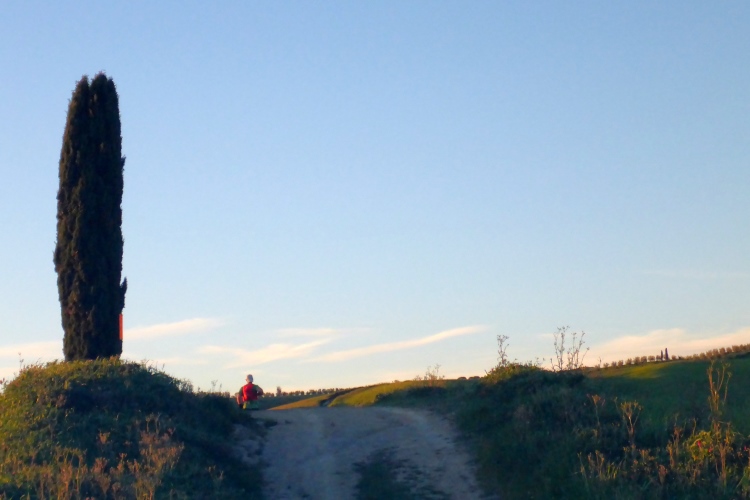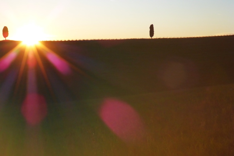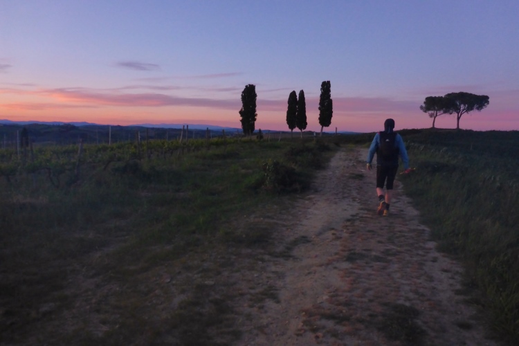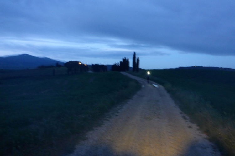 Der folgende Streckenabschnitt ist einfach traumhaft. In der untergehenden Sonne passieren wir Zypressenalleen und Weinfelder. Die Bäume werfen lange Schatten. Wir passieren einen bekannten Foto-Spot, wo die Fotografen auf das beste Licht gewartet haben. Der Himmel wechselt seine Farbe von einem satten Orange in ein fahles Rosa bis Lila. Die ersten Sterne funkeln dazwischen. Die Stimmung ist unbeschreiblich. Mit der untergehenden Sonne wird es frisch, aber wir sind gut unterwegs und frieren nur ein wenig, wenn wir länger stehen bleiben, was nur an den Verpflegungspunkten passiert, die etwa alle 10 Kilometer in einem der malerischen Städtchen untergebracht sind, die wir im fahlen Mondlicht passieren.