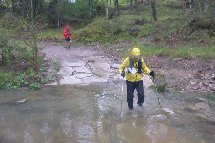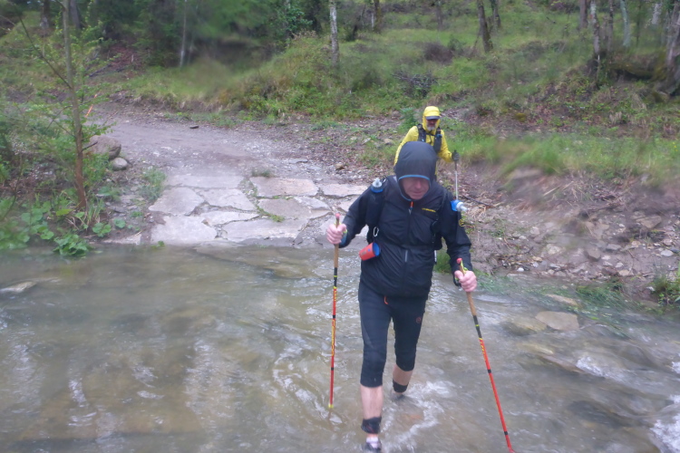 Nach Verlassen der Stadt steht nun stärker die folgende Fluss-Landschaft im Vordergrund. Die Waldabschnitte und damit auch der Single Trail Anteil wird höher. Leider wird auch das Wetter schlechter. Es beginnt zu regnen und kühlt ab. Eine Zeitlang folgen wir einem Fluss, den wir an einer dafür günstigen Stelle durchqueren. Mike überholt uns. Er liegt sehr gut im Rennen und ist noch recht frisch. Wir haben hier knapp 100 Kilometer und fühlen uns auch noch ganz gut. Jetzt sind wir nur noch zweistellig. Immerhin.