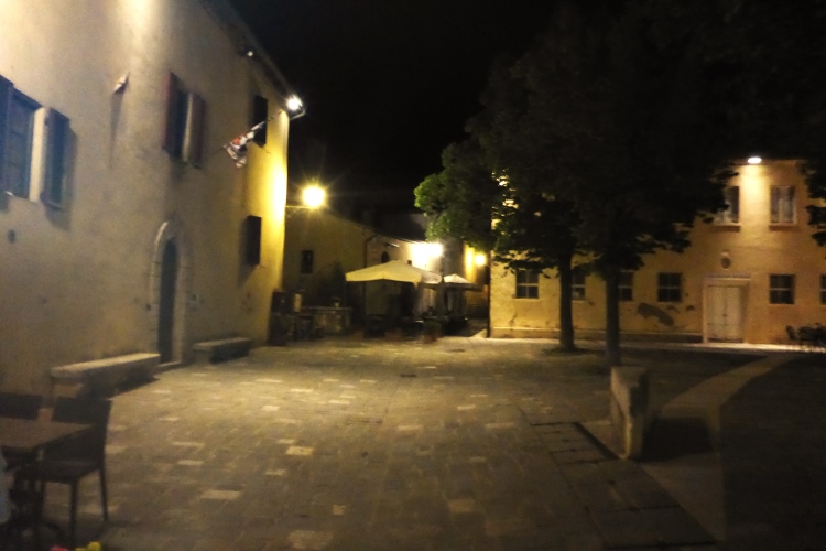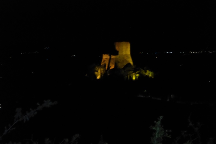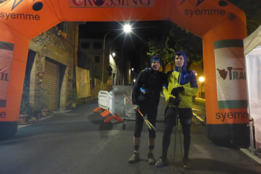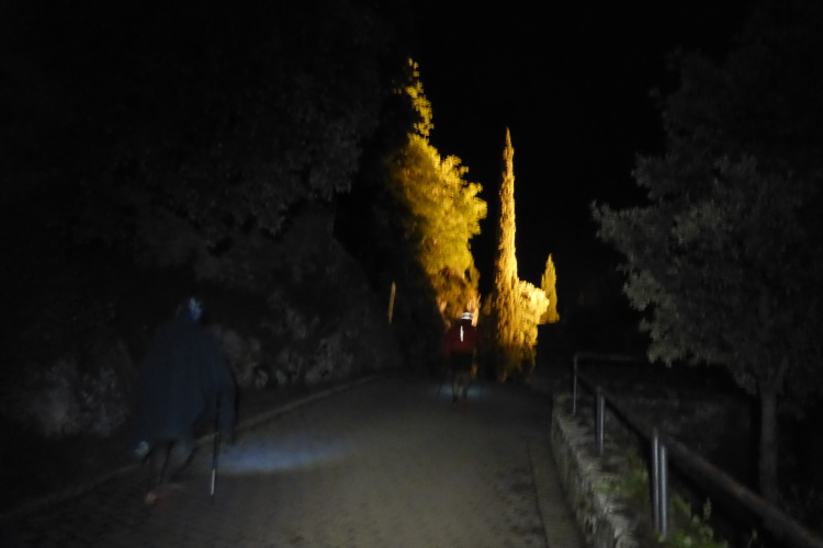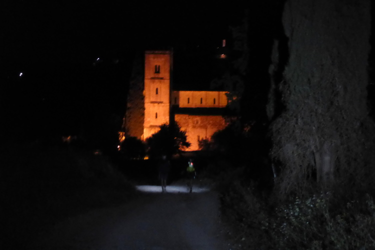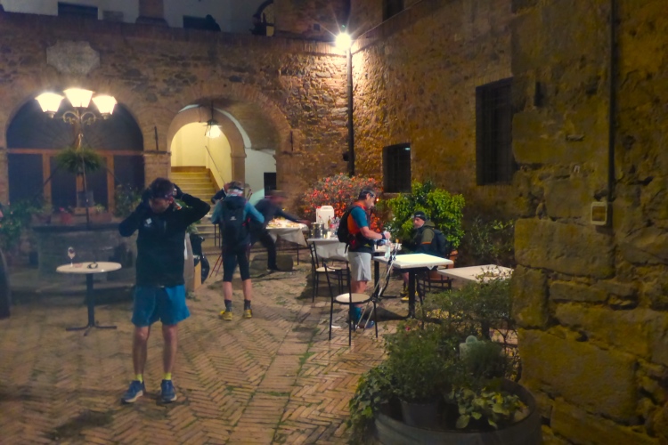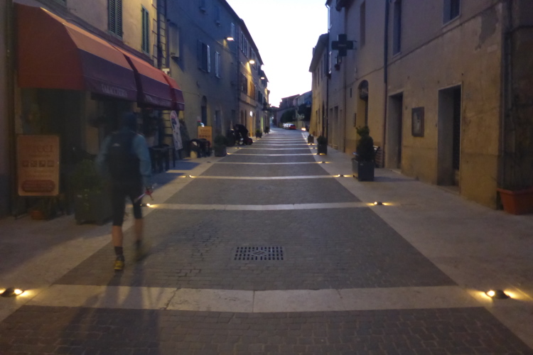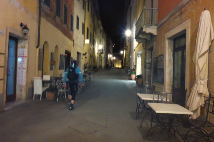 Noch vier Kilometer. Berghoch zwar, aber auf Fahrwegen. Es hat aufgehört zu regnen und die Schuhe sind ohne Schlamm etwa 2 Kilo leichter. Eine Wohltat. Vor uns thront hell erleuchtet unsere Burg auf der Rocca D‘Orcia. Erst flach, dann zweieinhalb Kilometer sehr steil. Wortlos erreichen wir den letzten Anstieg, den wir ohne ein einziges Mal stehen zu bleiben, hinter uns bringen. Nach dem Stadttor geht es noch bis zum höchsten Punkt an die beleuchtete Festungsanlage. Noch ein paar Meter und wir sehen an Ende der Gasse den Zielbogen, den wir recht unspektakulär durchschreiten. Endlich.