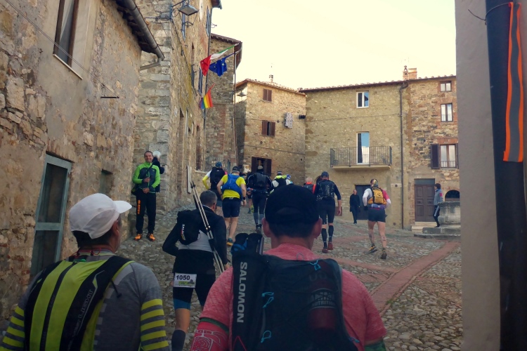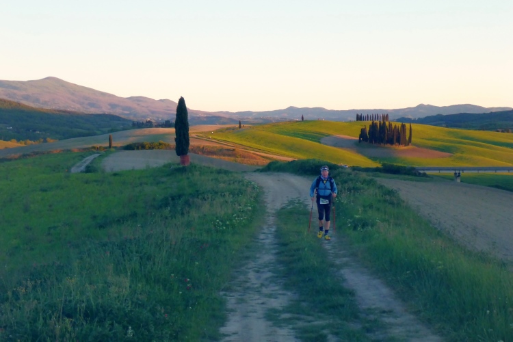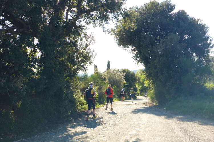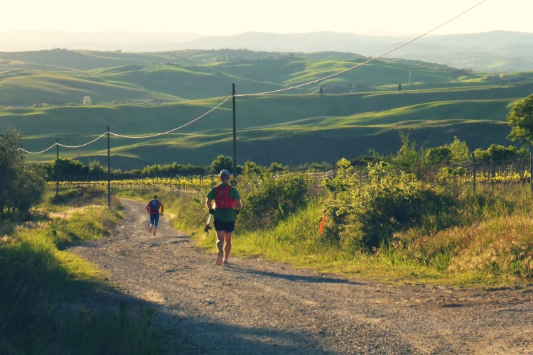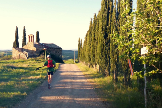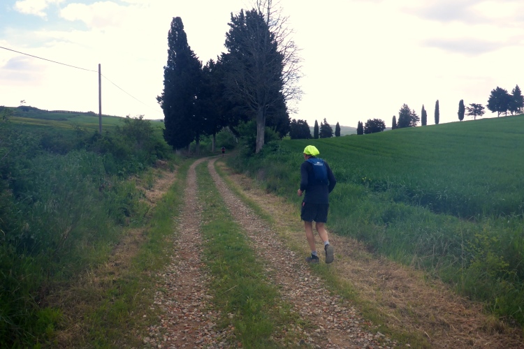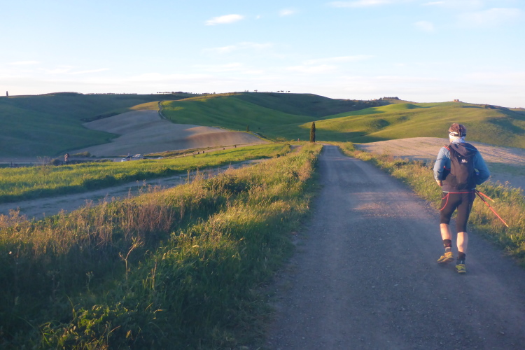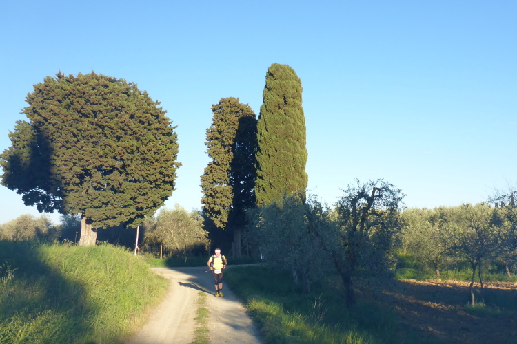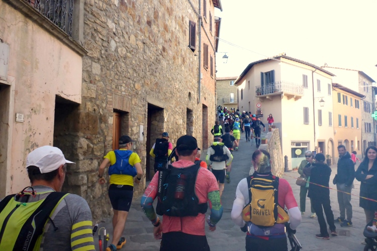 Pünktlich um 17 Uhr fällt der Startschuss. Wir durchqueren das mittelalterliche Städtchen. Die Anwohner, die Läuferinnen und Läufer der kürzeren Strecken und die Angehörigen säumen die engen Gassen und machen uns mit ihren Anfeuerungsrufen Mut für das kommende Abenteuer. Von jetzt an werden wir auf den weißen Wegen unterwegs sein, die die Landschaft durchziehen. Ein ewig langer Downhill bringt uns zu einer aufgegebenen Bahnlinie, auf der wir einen Tunnel durchqueren, um auf der anderen Seite wieder aufzusteigen. Wir durchqueren Wein- und Olivenplantagen. Die allgegenwärtigen Zypressenalleen und die traumhaften Ausblicke, lassen mein Läuferherz höherschlagen. Genau dafür sind wir hierhergekommen.