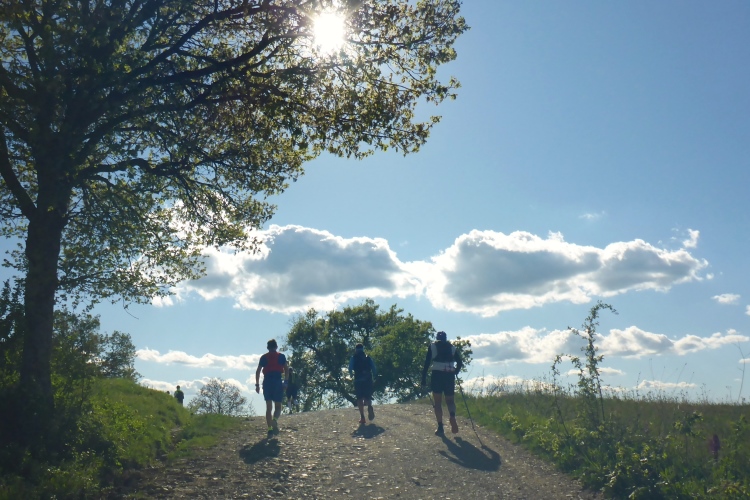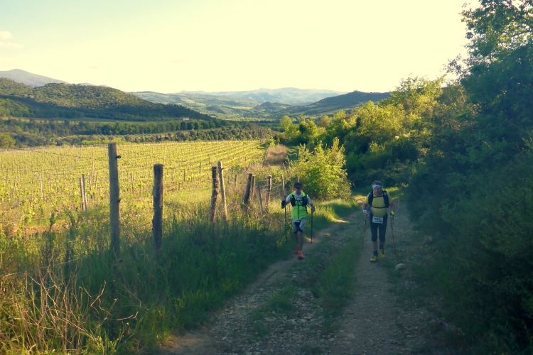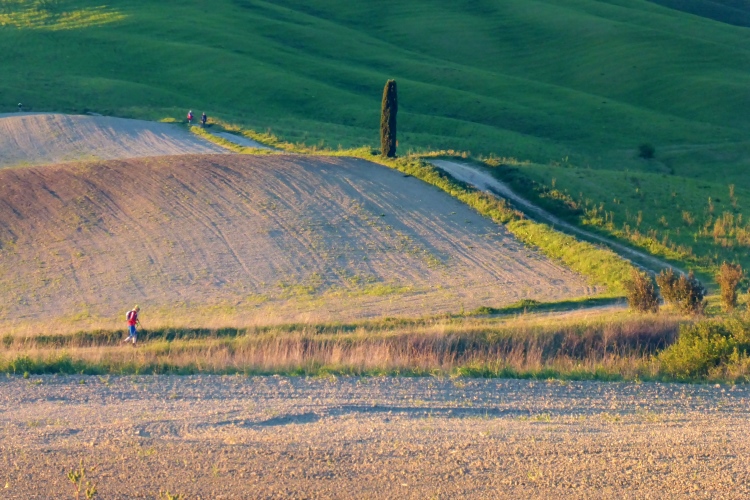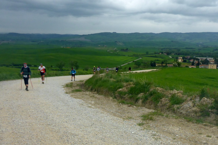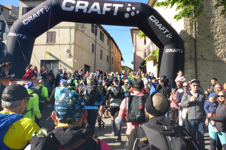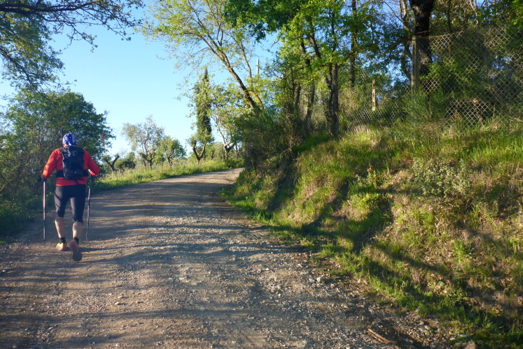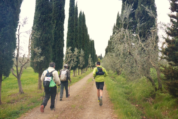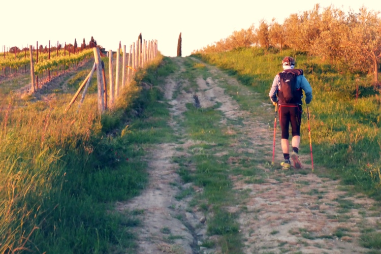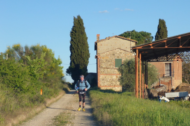 Pünktlich um 17 Uhr fällt der Startschuss. Wir durchqueren das mittelalterliche Städtchen. Die Anwohner, die Läuferinnen und Läufer der kürzeren Strecken und die Angehörigen säumen die engen Gassen und machen uns mit ihren Anfeuerungsrufen Mut für das kommende Abenteuer. Von jetzt an werden wir auf den weißen Wegen unterwegs sein, die die Landschaft durchziehen. Ein ewig langer Downhill bringt uns zu einer aufgegebenen Bahnlinie, auf der wir einen Tunnel durchqueren, um auf der anderen Seite wieder aufzusteigen. Wir durchqueren Wein- und Olivenplantagen. Die allgegenwärtigen Zypressenalleen und die traumhaften Ausblicke, lassen mein Läuferherz höherschlagen. Genau dafür sind wir hierhergekommen.