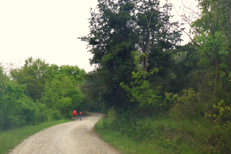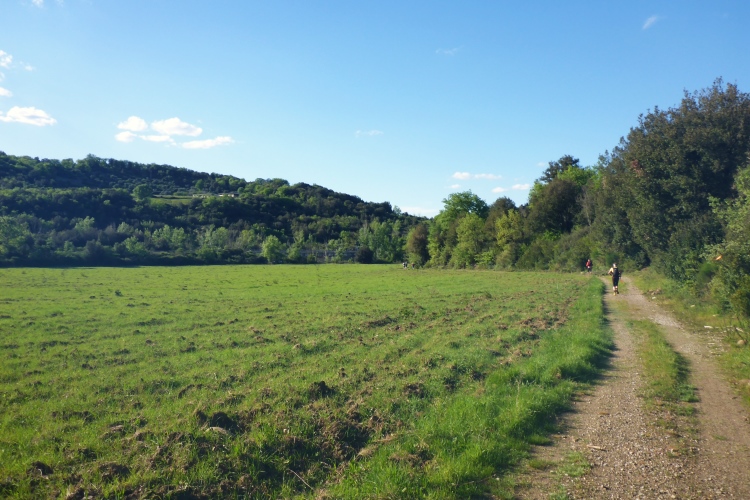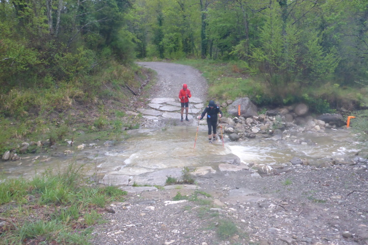 Kleine Bäche müssen ab und an überquert werden. Die Strecke ist recht flach und verläuft zunehmend im Wald. Bei toskanischem Wetter bestimmt recht angenehm, weil schattig, fehlen mir die schönen Ausblicke der ersten Schleife. Der trübe Himmel und der kalte Regen schlagen auf die Stimmung. Katja zieht an uns vorbei. Sie macht uns wieder Mut, wie wir auch von den anderen Läuferinnen und Läufern immer wieder liebe Worte der Aufmunterung und des Respekts erhalten. Wir haben das Flusstal hinter uns gelassen und sind wieder in toskanischer Bilderbuchlandschaft.