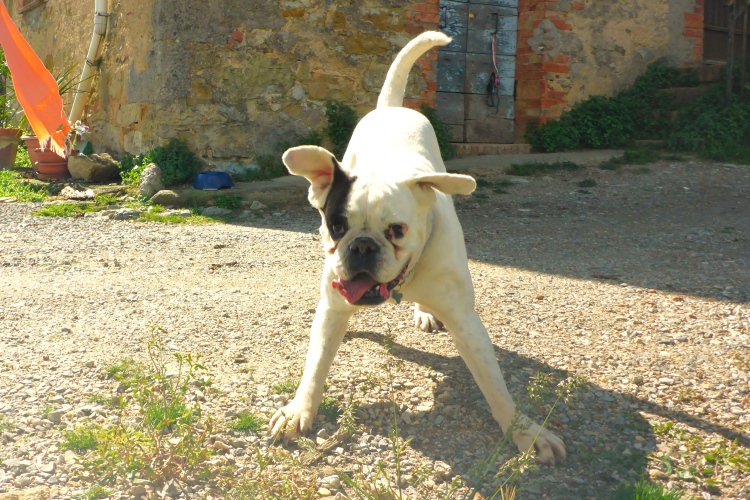 Schnell verdränge ich den Gedanken und blicke nach dem mittelalterlichen Örtchen Castiglione, das etwa 4 Kilometer entfernt auf einem Kalkfelsen von einer schmucken Festung überragt wird. Ich fühle mich aus der Zeit gefallen. Keine modernen Gebäude stören den Anblick. Auf jedem sanften Hügel eine Villa, die Wege gesäumt von mächtigen Zypressen. Dazwischen Wein und Olivenbäume. Ein Traum. Darüber am blauen Himmel die warme Sonne. Es zieht noch ein wenig Dunst aus den Tälern. Die letzten Überreste der regnerischen Nacht. Wir werden von einer Bulldogge begrüßt, die sich anscheinend sehr über unsere Anwesenheit freut. Mit dem Frühstück warten wir noch auf Katja und Mike, die es gestern nicht mehr über den Alpenhauptkamm geschafft haben. Sie werden morgen früh auf der 103 Kilometer-Strecke starten.