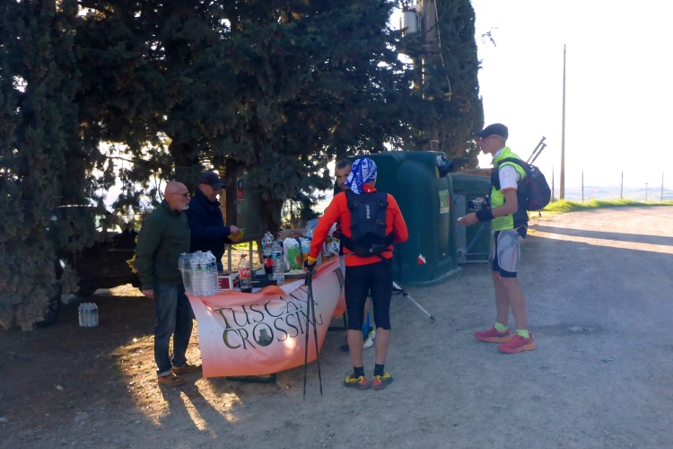 Die Sonne steht schon niedrig und legt ihr warmes Licht über die Hügel. Ehrfürchtig genieße ich jeden Meter des Rennens. Schnell erreichen wir das erste Ristoro, was so viel wie Stärkung oder Erfrischung bedeutet. Diesmal will ich alles richtig machen und versuche, mich von Anfang an richtig zu verpflegen und vor allem genug zu trinken. Also fülle ich die leere Flask und gebe eine halbe Elektrolyt-Brausetablette dazu. Das gibt einen guten Geschmack und ein paar Mineralien.
