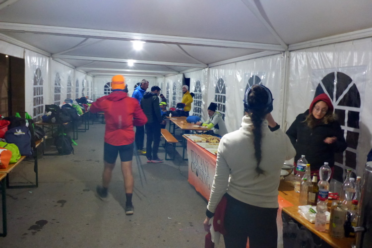 Wir sind fix und fertig. In der warmen Halle geben wir den GPS-Tracker ab und erhalten dafür eine Medaille aus gebranntem Ton. Auf das Essen verzichten wir. Dann sammeln wir unsere Dropbags ein und holen uns noch zwei Mülltüten. So wie wir aussehen, können wir uns nicht ins Auto setzen. Die Schuhe ziehen wir aus und stecken sie ebenfalls in eine Mülltüte.