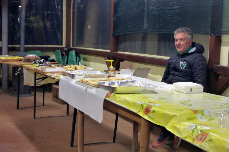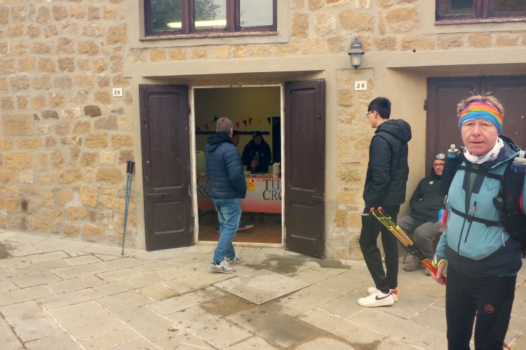 An das Bergab-Geschlitter habe ich mich fast schon gewöhnt. Das größere Problem sind die vielen kurzen, steilen Gegenanstiege Anstiege im lehmigen Schlamm. Bei jedem Schritt befürchte ich, dass mein Schuh stecken bleibt. An der Sohle hängen 5 Zentimeter Pampe und ich freue mich über jede Pfütze, ohne die man den Ballast einfach nicht loswird. Auch ein Ausweichen nutzt nichts. So quälen wir uns die nächsten Kilometer weiter, bis wir an dem letzten Ristoro ankommen. Ein Bonus Posten, der nicht angekündigt war.