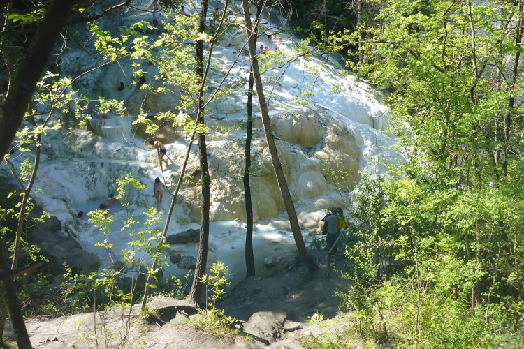Die führen uns jetzt nach Bagni San Filippo, wo mit heißen Schwefelquellen das Thermalwasser mit seinen weißen Kalkablagerungen ein Badeparadies geschaffen hat. Die wenigen Besucher baden in dem warmen Wasser des Flusses. Uns zieht es aber weiter in den winzigen Ort, wo wir uns am Ristoro für den längsten Anstieg zum Vivo D’Orcia noch einmal stärken. Immerhin liegt der Gipfel auf 1050 Meter. Der Blick zum Himmel verheißt nichts Gutes. Und schon 5 Minuten, nachdem ich mich aller wärmenden Schichten beim sonnigen Anstieg entledigt hatte, ziehe ich Schicht für Schicht wieder an. Dann geht das Theater auch schon los. Erste Hagelschauer gehen herunter. Besser als Regen denke ich. Man wird halt nicht so nass. Dann sinkt schlagartig die Temperatur. Ein Grollen zieht über den Berg und eröffnet einen Hagelsturm, der in wenigen Minuten mit seinem körnigen Weiß den Waldboden bedeckt. Stoisch ziehen wir den Berg hoch. Den Kopf zur Seite geneigt. Der Hagel von vorne tut einfach zu weh im Gesicht. Nicht schon wieder denke ich. Das hatten wir erst auf unserem letzten Rennen in Volvic. Mit dem Wetter stehe ich irgendwie auf Kriegsfuß.