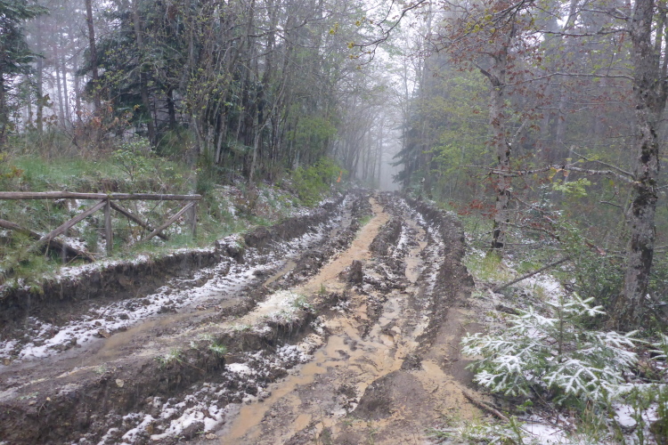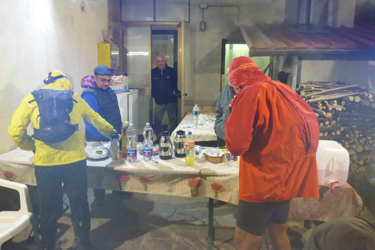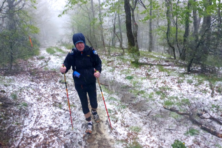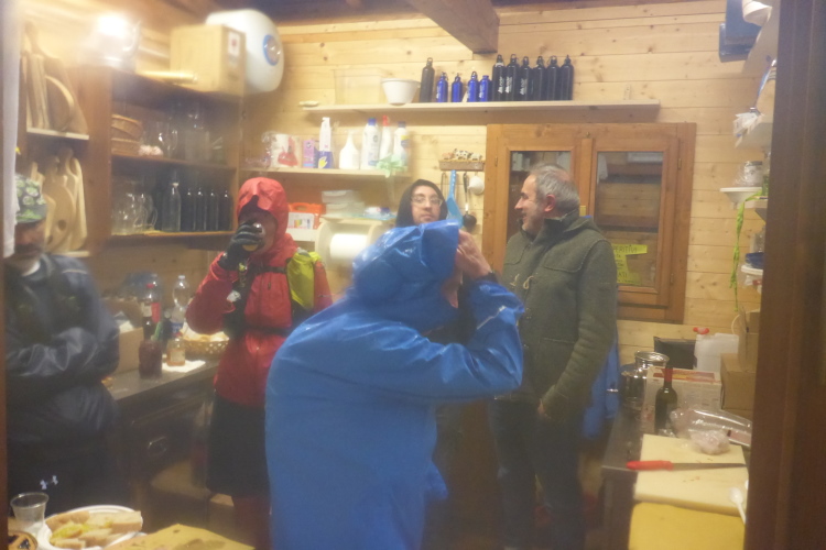 Nach der höchsten Stelle geht es leicht bergab, dann nochmal in die Höhe. Das müsste es jetzt gewesen sein. Nix wie runter von dem Berg. Aber da beginnen erst die eigentlichen Schwierigkeiten. Eine steile Schlammrutschban mit einer zwei Zentimeter dicken Hagelschicht lässt uns nach unten schlittern. Meine Beine beschweren sich lautstark. Irgendwann wechsele ich in die Schlammrinne, mir ist jetzt alles egal. Immerhin wird es mit jedem Meter wieder wärmer. Aus dem Hagel wird Regen, dann werden auch die Wege wieder besser. In der kleinen Hütte des Ristoro stehen wir dicht gedrängt und schlürfen warme Getränke. Das Schlimmste haben wir hinter uns.