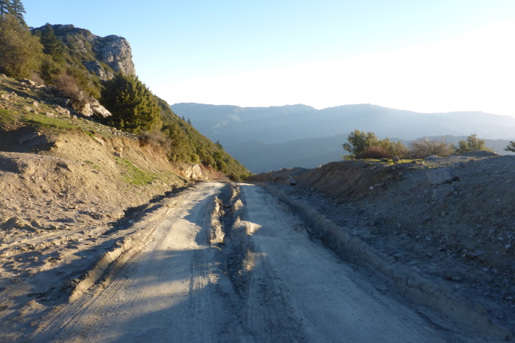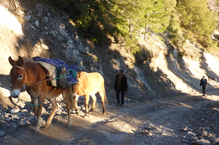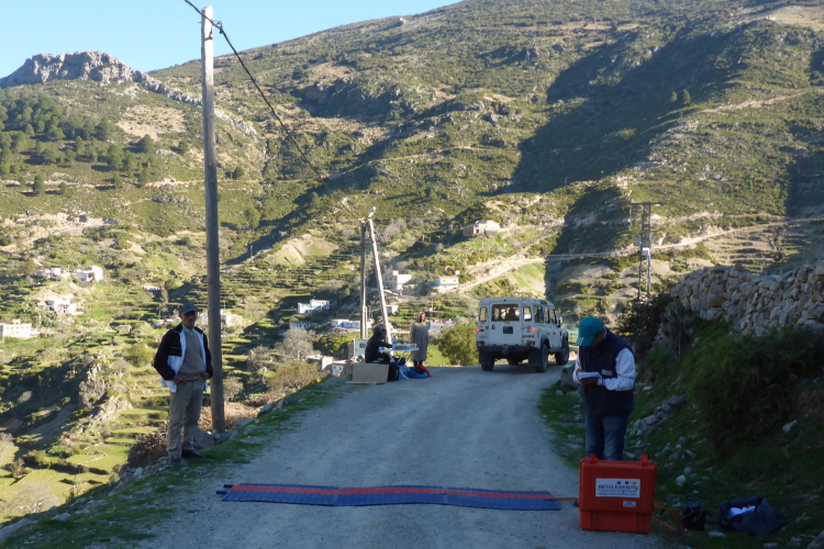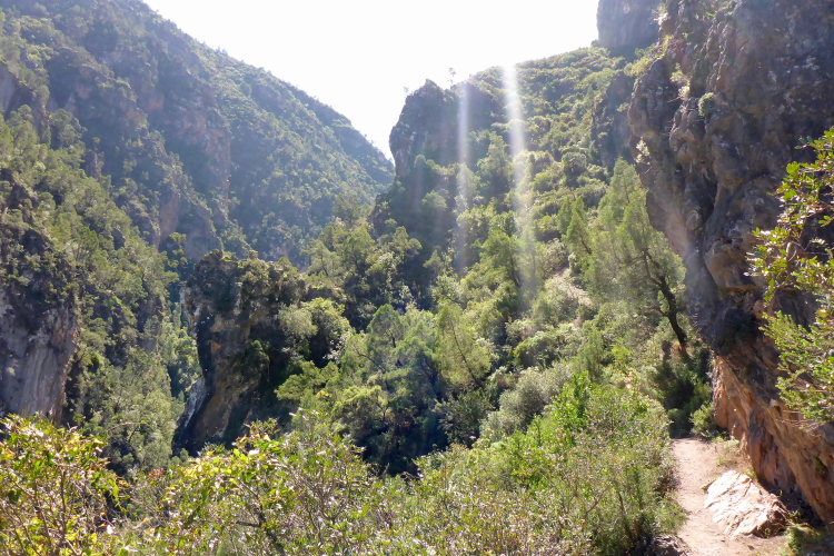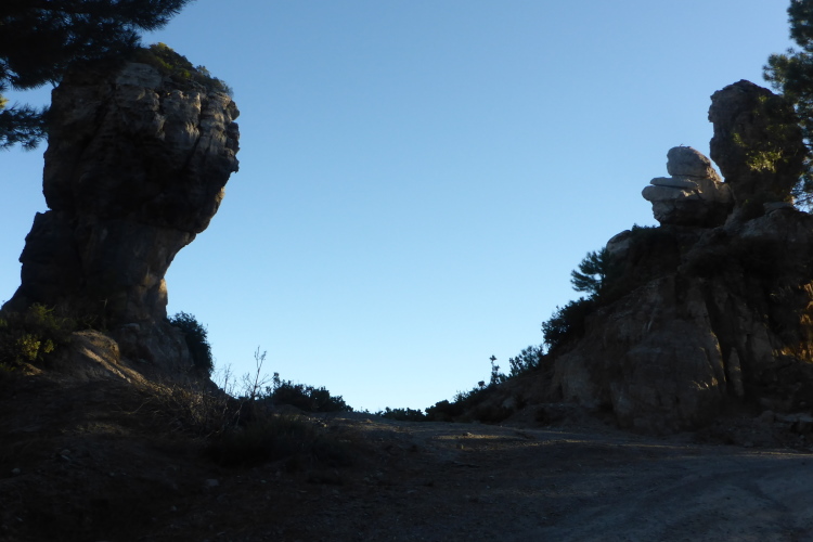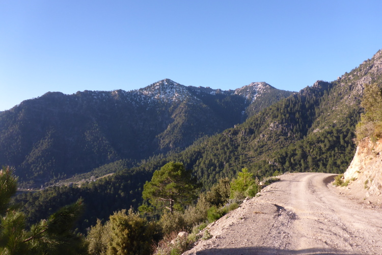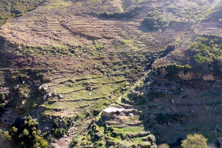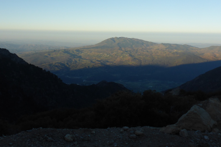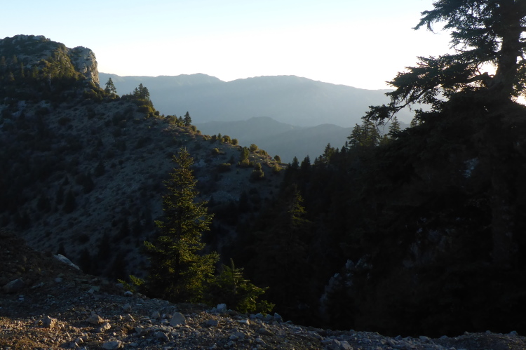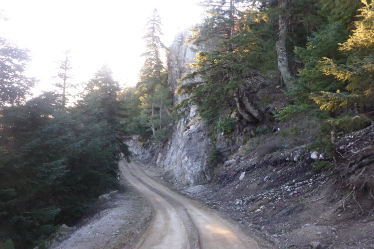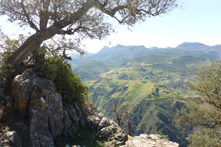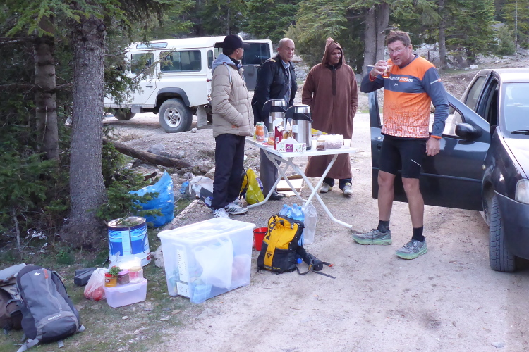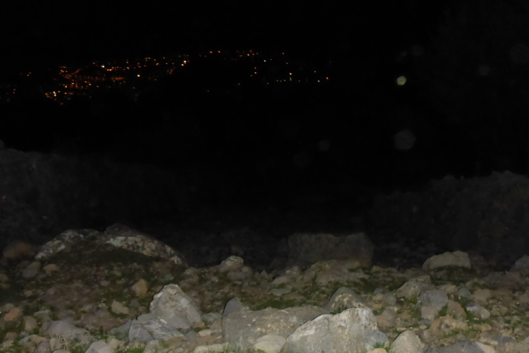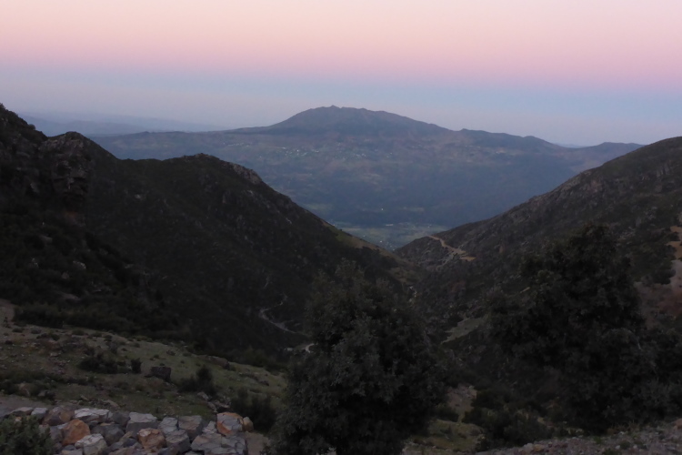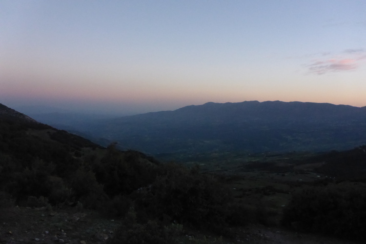 Oben am Jbel-El Kelaa (1616 m) sehe ich die Stirnlampen der letzten zwei Läufer, dann bin ich allein. Der Sonnenaufgang kündigt sich an, ich erkenne die schroffen Spitzen des Gebirges. Eine Eule begleitet mich, macht mir klar, dass dies ihr Revier ist. Der Weg wird ein wenig ebener, dann geht es weiter hinauf nach Ain Tissimlane, das von den hohen Kalksteinwänden des Sfiha Telj überragt wird. Der Blick ist beiseitig phantastisch, man sieht sogar das Mittelmeer.