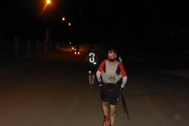 Bei CP Tissouka (km 75) verabschieden sich glücklicherweise meine Betreuer wortlos. Jemand von der Organisation begleitet mich zum nächsten PC, entschuldigt sich permanent, dass er mich in meiner Trance nicht stören wolle, er aber den Leuten bei Nr. 8 Bescheid sagen müsse, dass ich noch komme. Ich bin der letzte Läufer und glücklich über seine Betreuung, muss ich doch nun nicht mehr auf die Markierung achten. Es geht eine fiese Schotterstraße mit viel Verkehr entlang. Es wird wohl überall geheiratet, ganze Kolonnen volltrunkener Kleinbusse brettern vorbei. „Attention, Attention!“, ich springe gerade noch zur Seite, mein Puls springt hoch, als ich den Windhauch des Außenspiegels spüre. Mann, war das knapp!