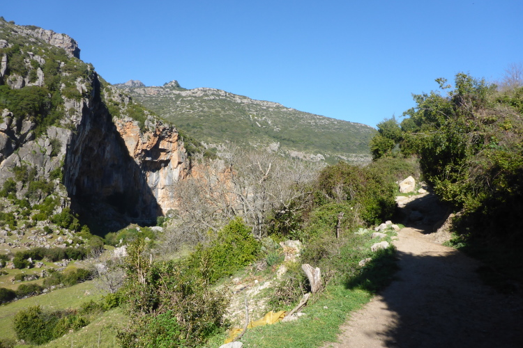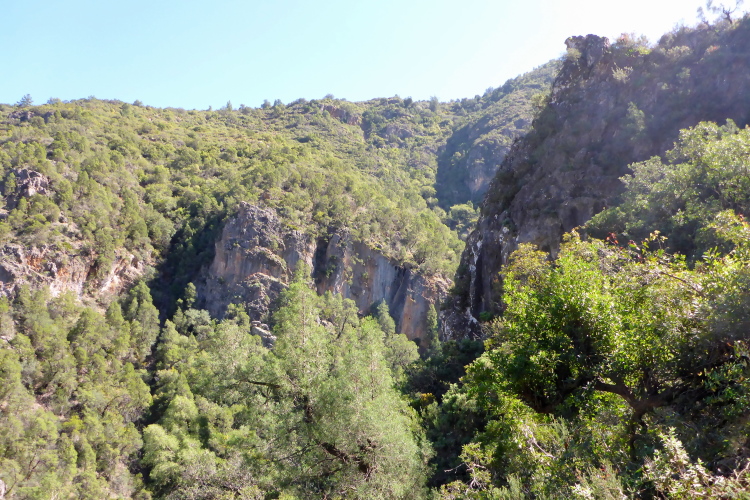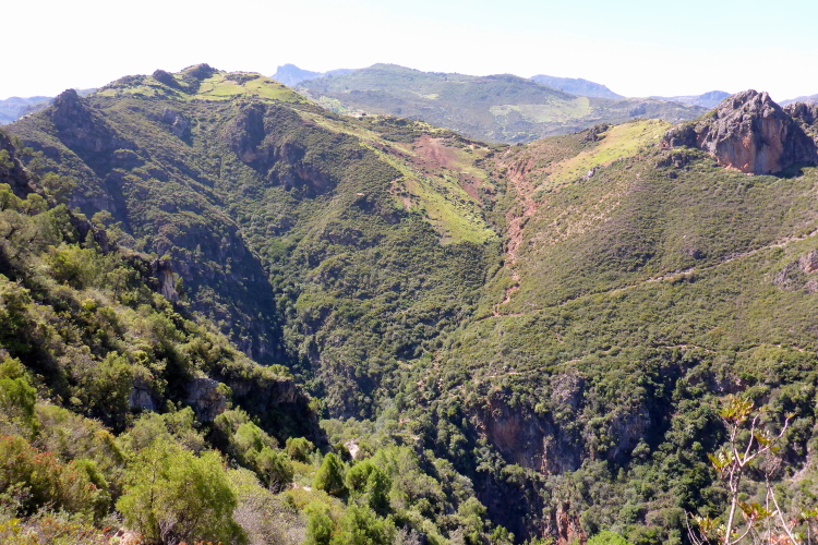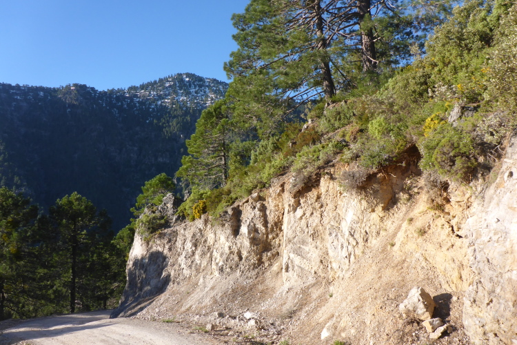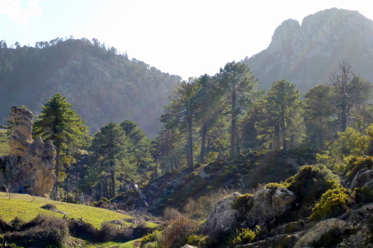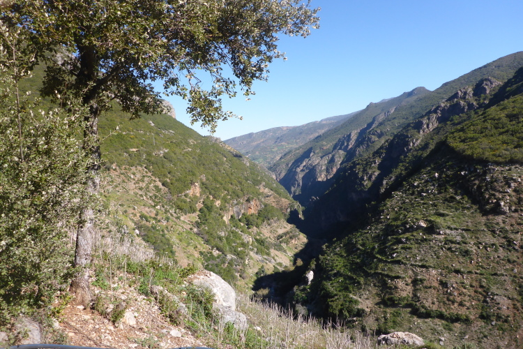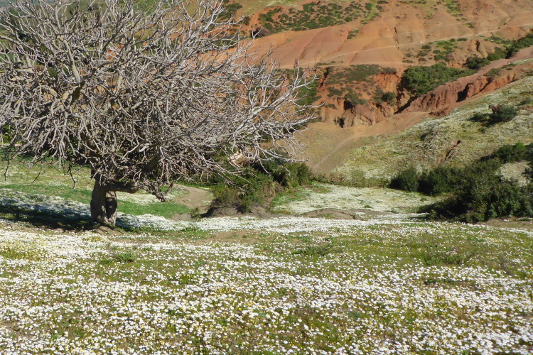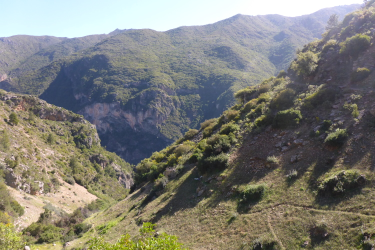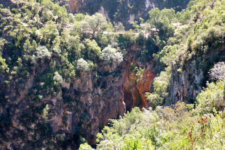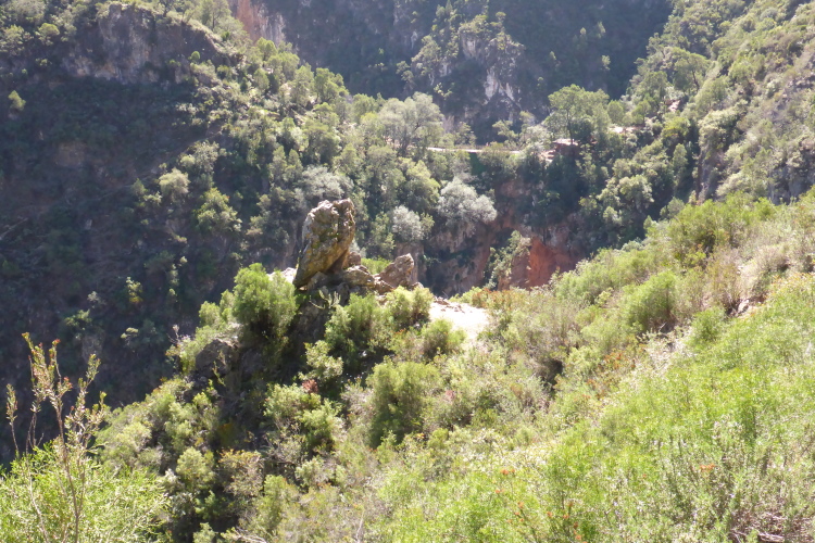 Nach wenigen Metern sind wir im Nationalpark Tallasemntane (klare Quelle). Ein Park mit enormen Schluchten, der die letzten Reste von Tannen und Kiefern, die die Römer nicht abgeholzt haben schützt. Unser Trailrevier wird immer wieder in das Gebiet des Nationalparks eindringen, der eine Vielzahl von Tieren und Pflanzen beherbergt, die hier im europäisch/afrikanischen Bereich endemisch sind. Ich werde Ausschau nach Berberaffen, Ottern, Gold- und Königsadlern und Bartgeier halten. In manchen Reiseführern wird von Wölfen erzählt. Das ist ein Übersetzungsfehler der Engländer, Füchse sind keine Wölfe. Wildschweine werden wir auch nicht sehen. Die Skorpione sollen nicht so giftig wie im Hohen Atlas sein, bis auf den roten Skorpion. Also sollte man nachts nicht unter Steine greifen, was ein Läufer normalerweise ja auch nicht macht. Jetzt im Frühling ist die Hufnasennatter aktiv. Ich auch.