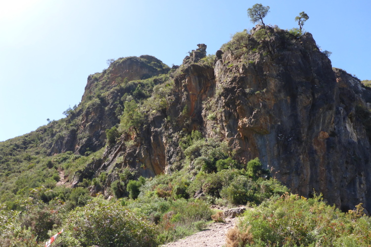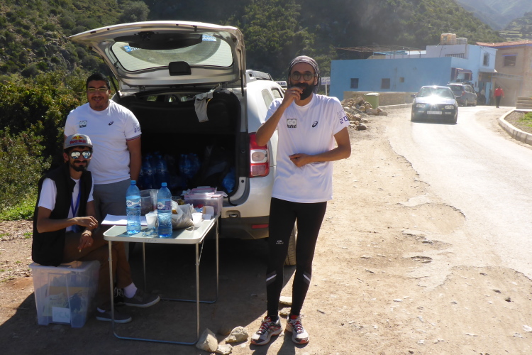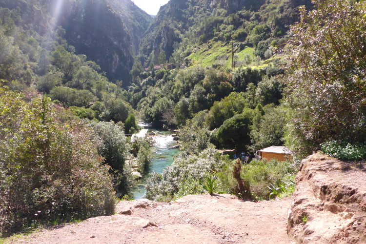Bei km 16 liegt unter mir Afeska und vor mir der nächste PC. Auch hier meine verzweifelte Frage nach meiner Eigenverpflegung. Alle schauen mich nur entgeistert an. Die Strecke wendet sich nach Norden, Richtung Sidi (heilige Quelle) Meftah. Hier ist ein Marabout, eine Begräbnisstelle eines Heiligen. Es geht aus dem Wald hinaus und in Serpentinen runter nach Imizzar am glasklaren Qued Farda. Hinter dem Fluss geht ein Weg unterhalb beeindruckender, überhängender Felsen entlang, steil hinab, man sieht den Grund der Schlucht nicht. Das Geröll ist sehr schwer zu laufen, ich muss seitlich gehen.