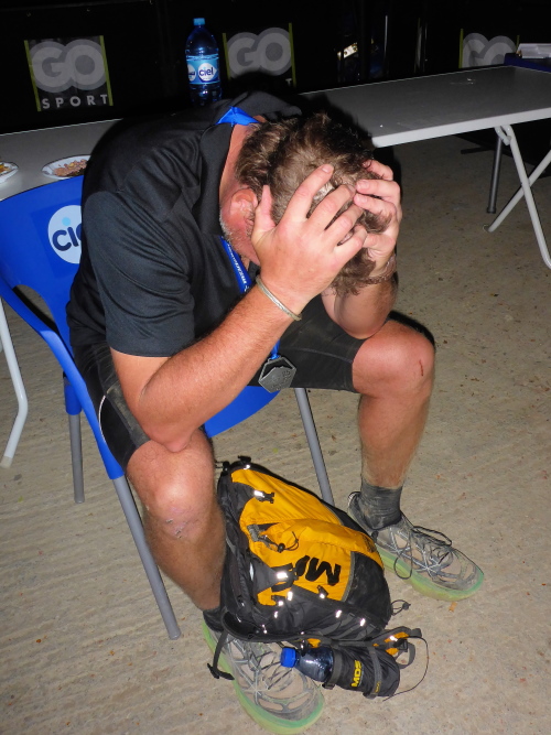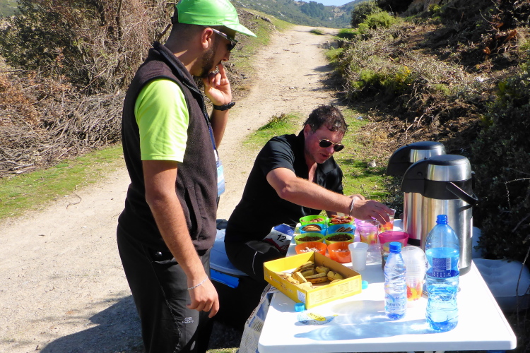 Nach zwei Stunden bin ich am Pass Chouihate auf 1820 m Höhe und am ersten PC (Point Control). Die Frage nach meiner Eigenverpflegung, die Morgane doch verteilt haben muss, wird ignoriert und mir ist klar, ich muss spanisch sprechen. Man versteht, schaut mich entsetzt an: „Was bisten du für einer?“ Augenblicklich wird mir eiskalt, hinter dem PC sind Schneereste. Von nun an geht es 1500 Meter steil bergab, augenblicklich schmerzen die Oberschenkel.