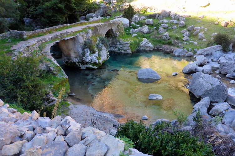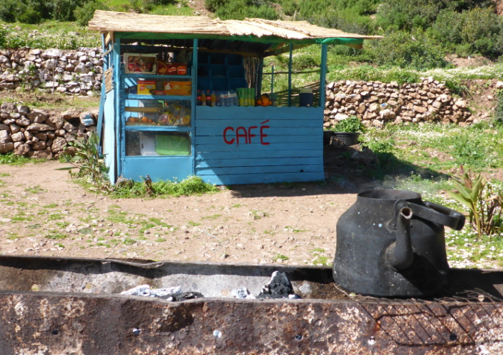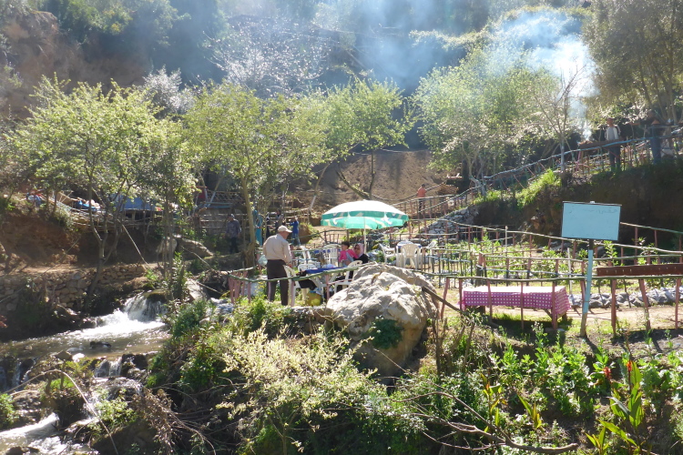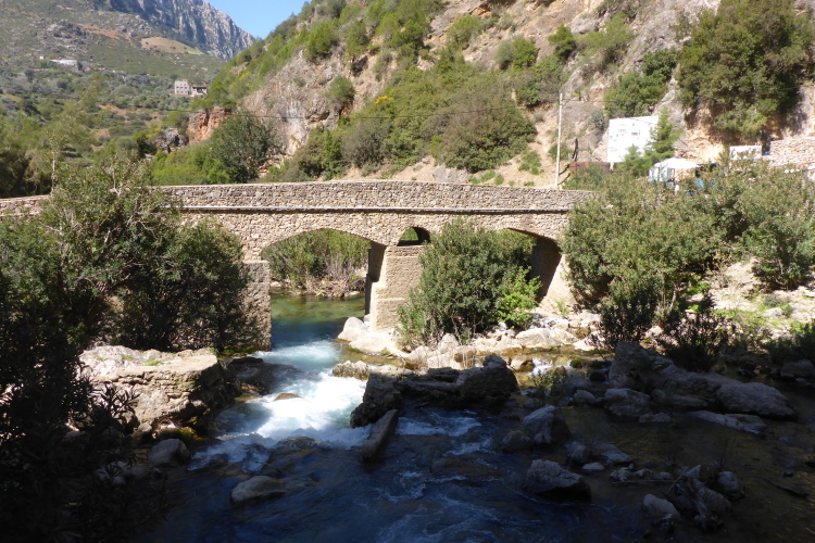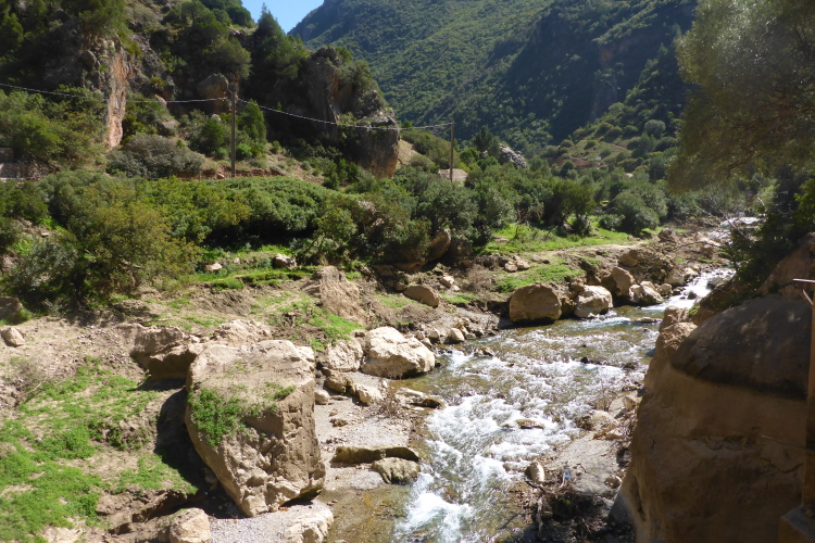 Akchour (km 34) liegt nun schon wieder auf einer Höhe von 398 Metern am Oued Kelaa, wo ein einladendes Café seine Getränke im Fluss kühlt. Von hier aus gäbe es über eine holprige Piste eine Rückfahrtmöglichkeit mit den Helfern nach Chaouen. In Talembote könnte man sich auch noch für 15 Dirham (1,5 Euro) ein Taxi nehmen. Ich kaufe mir vier Flaschen warme Cola. Normalerweise laufe ich solches Terrain mit 1,5 Litern Flüssigkeit auf 10 Kilometern, jetzt habe ich 5 Liter dabei. Eine glückliche Fügung, die mir in den folgenden Stunden das Leben retten wird.