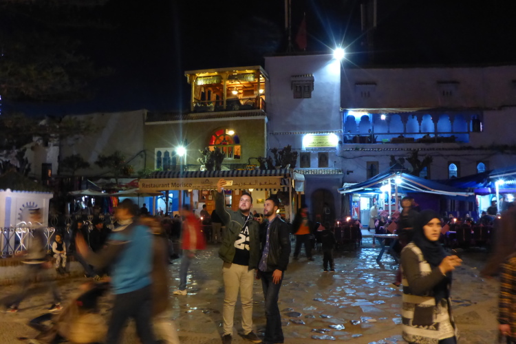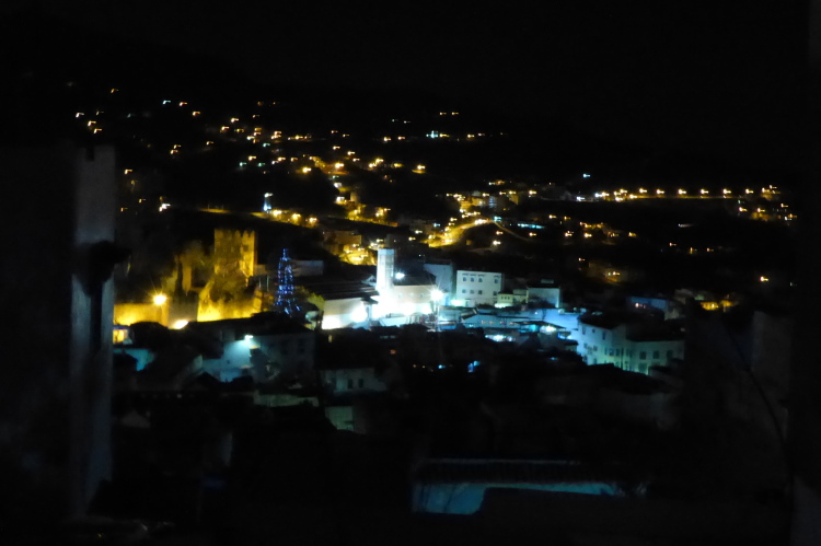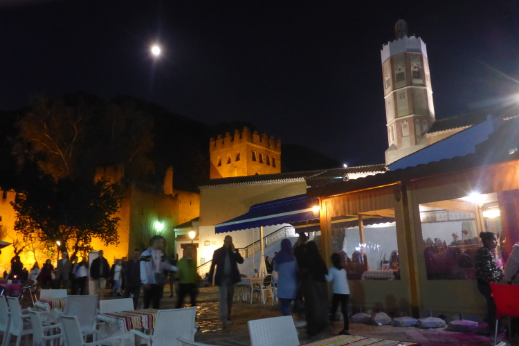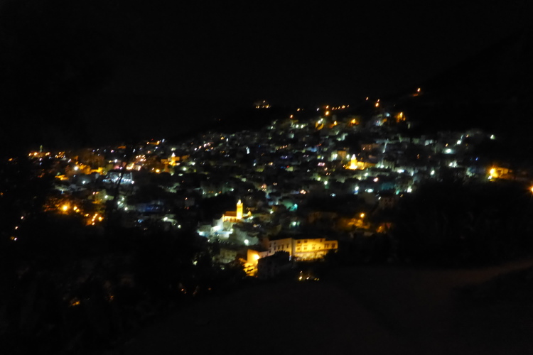 Vom ersten Aussichtpunkt gibt’s nun einem geilen Blick über die blaue Perle Chaouen: die majestätische Kasbah, den inneren Gartenund die alte Medina, die von einer mit Zinnen bewehrten Mauer umgeben ist, alles überragt vom Turm der Moschee( 15.Jahrh). Und dann ist Gebetszeit. Es beginnt der einschläfernde Morgengesang „Allahu Akbar“, und da Chaouen sehr konservativ ist, gibt es an jeder Ecke Lautsprecher, die miteinander wetteifern. Ein fremdartiger Klangteppich liegt über der blauen Stadt, die nun im Licht der Laternen gelb leuchtet.