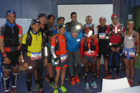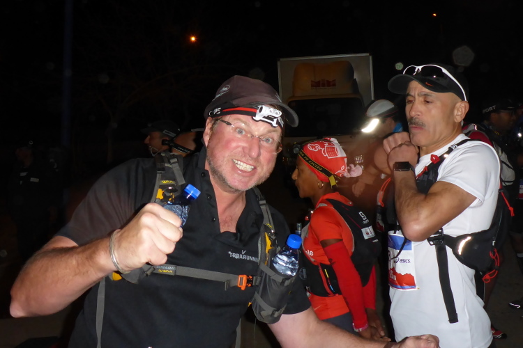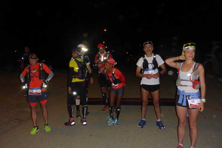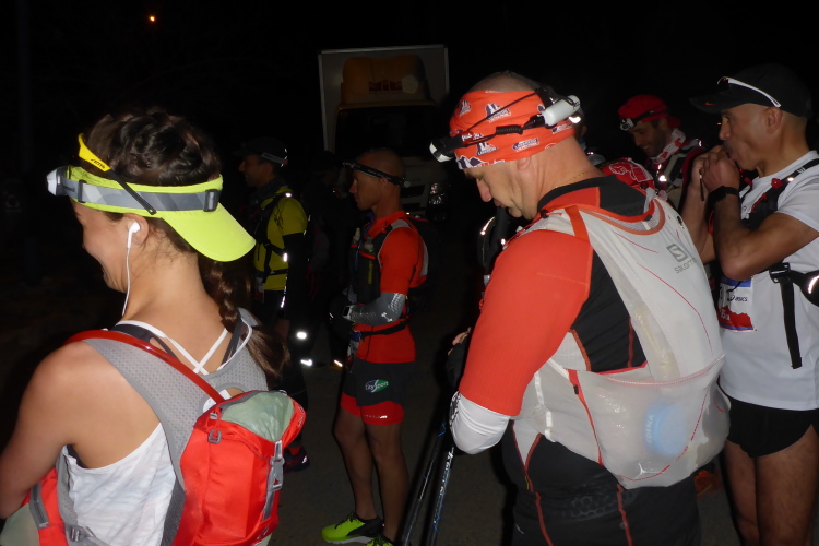 Samstag, 5 Uhr Start vor dem Hotel (700 m Höhe). Irgendwer leitet mich in einen Container. Dort nochmal Briefing, 8 Läufer sind nicht angetreten, wir sind also zwölf. Im letzten Jahr mussten einige Läufer im Schneetreiben aufgeben, die Wege waren schlammig, es gab Verletzte. Mich erwartet heute Sonnenschein mit 5-40 Grad.