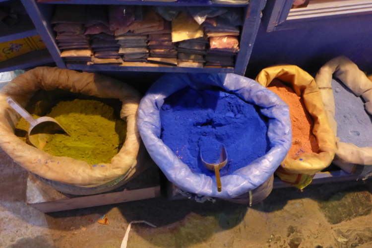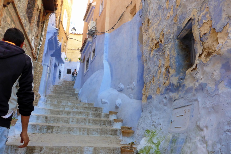 Der Aufstieg vom Busbahnhof (Gare Routiere) zum Place Outa el Hammam, wo man sich für den Lauf einschreibt, ist ein kleiner Vorgeschmack dafür, was mir morgen bevorsteht. Eines der kleinen blauen Taxis hätte 1 Euro gekostet, aber ich bin ja Läufer. In der Medina ist also alles blau. Fast, denn plötzlich ruft jemand: „Stop! Dangereux!“ Da werde ich schon heftig angegiftet und lerne, dass man niemals blaue Wege gehen darf. Die sind privat. Und hier versteht man keinen Spaß, seitdem Japaner die schönste Stadt Marokkos für sich entdeckt haben. Ansonsten gibt es noch junge Menschen, die mit verfilzten Haaren und selbstgemachten Tattoos rumlaufen. Also: man darf nur unbemalte Wege gehen.