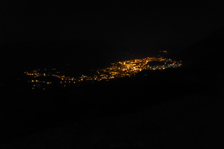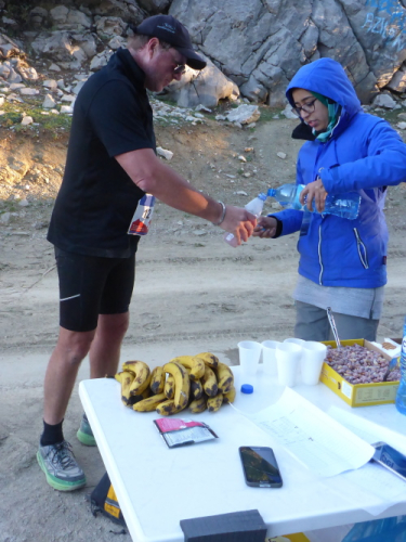 Hier liegt mein „equipaje para ropa reemplazo“ und ich werfe mir warme Kleidung über und Gels rein. Es sind nur noch 35 Kilometer, in 7 Stunden werde ich im Ziel sein! 1000 Höhenmeter geht es hinab zum CP Bab Taza (km 62), die Parkranger fahren hinter mir her. Immerhin, 50 cm Abstand halten sie ein. Deren Zigarettenrauch vermischt sich mit dem Abgas ihrer alten Karre. Nach 2 Stunden verschwinden sie endlich, als hätte ihre Mutter verkündet, dass das Abendessen fertig ist. Doch auf der nächsten Anhöhe steht die verdunkelte Karre wieder und ein Ranger wirft eine Getränkedose aus dem Fenster. „Das Duell“ (1971) ist ein Thriller von Steven Spielberg, bei dem ein verdunkelter Tanklaster den Geschäftsmann David verfolgt. Der ganze Film ist wortlos, so wie diese Szene, als das verdunkelte Rangerauto oben am Pass steht, und Michnun mir wieder im Abstand von 50 cm folgt. Als es dann aber dunkel wird, bin ich froh, dass ich Scheinwerferlicht habe.