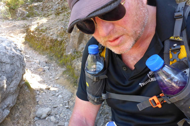 Der erste 1100 Meter Aufstieg beginnt. Fehlgeleitet von einem ahnungslosen Helfer (normal) kommen mir meine Leidenskollegen entgegen. Ich raffe schnell, drehe um, liege auf Platz eins, lasse mich aber dann aber voller Respekt zurückfallen.