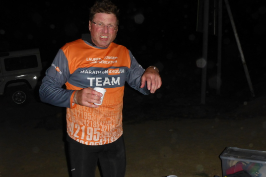 Bei CP 8, bei Tissouka, verabschiedet sich mein Lebensretter. Ich begreife später, weshalb: die letzten 10 Kilometer sind grausam. Ich diskutiere lange mit allen (10) Anwesenden, erkläre denen, dass die Markierungen scheiße sind, dass ich hier nicht mehr alleine laufen und dass ich endlich meine Eigenverpflegung haben will. Wir einigen uns darauf, dass sie nach 5 Kilometern an der Abzweigung auf mich warten, um mir den weiteren Weg zu weisen. Ich bekomme ein Handy in die Hand gedrückt, das bimmelt auch kurz darauf in der Dunkelheit, ich geh aber nicht dran. Wieder brettert eine Hochzeitsgesellschaft mit 20 Autos an mir vorbei, der Staub raubt mir die Luft.