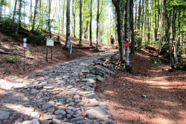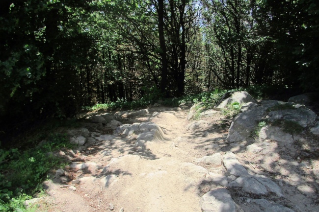 Der nächste Abschnitt zum Monte di Fo ist ähnlich schön. Der Wanderweg führt immer wieder über die Reste einer alten römischen Militärstraße, sonst verläuft er auf Singletrails oder Waldwegen. Und die sind manchmal ordentlich zerfurcht. Da toben sich wohl immer wieder die Fahrer von Motocross-Maschinen ordentlich aus.