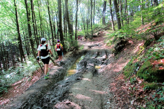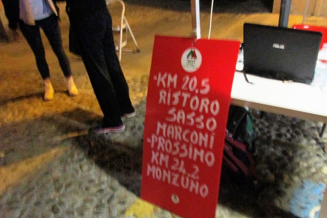 Ziemlich abwechslungsreich winden sich die schmalen Pfade meist eben durch Wald und Buschwerk entlang des Reno. Der erste Checkpoint (CP) mit Verpflegung befindet ich in Saso Marconi bei km 20,5. Das Verpflegungsangebot ist typisch italienisch und damit sehr überschaubar: Bananen, Trockenfrüchte, süße Kekse, Weißbrotscheiben mit Nutella oder Marmelade, Nüsse und für mich bei diesem Überangebot an Süßem überlebenswichtig, Parmesan. An Getränken werden nur Wasser und Iso angeboten.