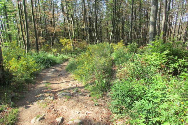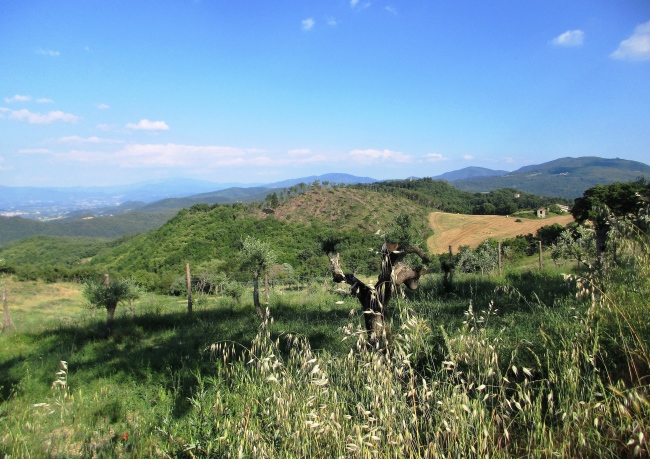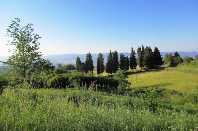Nach Monzuno beginnt der für mich landschaftlich reizvollste Teil. Das liegt nicht nur daran, dass es jetzt heller Tag ist. Der Wanderweg verläuft nun abseits der Zivilisation. Die Trails sind schmal, steinig, teilweise geht es steil bergab oder bergauf. Weite Teile der Strecke verlaufen im Wald, dennoch bieten sich immer wieder schöne Ausblicke. An zwei Stellen kann man sogar die Spiegelung der Morgensonne im adriatischen Meer erkennen. That´s trail at its best!
