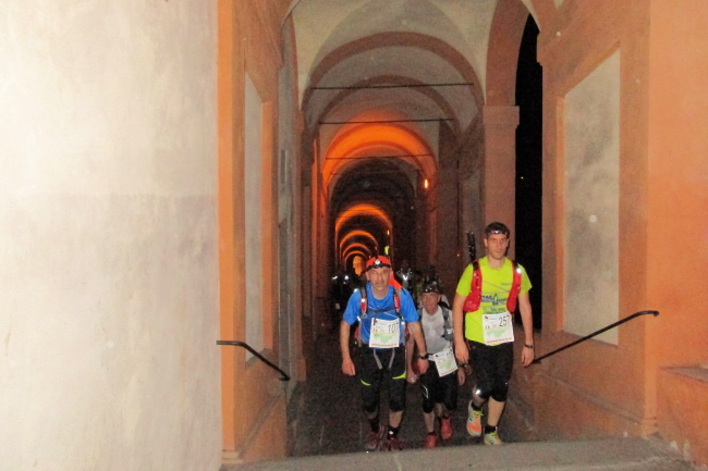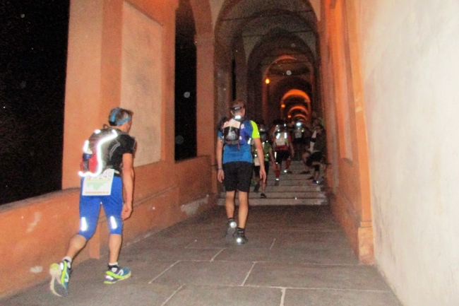 Diese Arkaden führen uns über 489 Stufen bis zum Santuario della Madonna di San Luca, einer Basilika auf einem Hügel westlich der Altstadt. Unter uns liegt die erleuchtete Stadt, über uns ein klarer Sternenhimmel. Vor uns beginnt der Trail, der recht steil und steinig hinunter nach Bregoli führt.