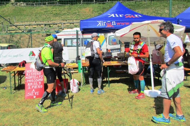 Der CP 4 am Monte di Fo liegt am Rande eines Campingplatzes. Hier finden wir unsere Kleiderbeutel, die in Bologna abgegeben werden konnten. Ich mache mich kurz frisch und ziehe ein trockenes Shirt über. Am Verpflegungstisch gibt es erstmals Nudeln mit Tomatensoße. Leider keine Löffel oder Gabeln. Also schütten wir uns die Nudeln aus dem Becher direkt in den Mund.
